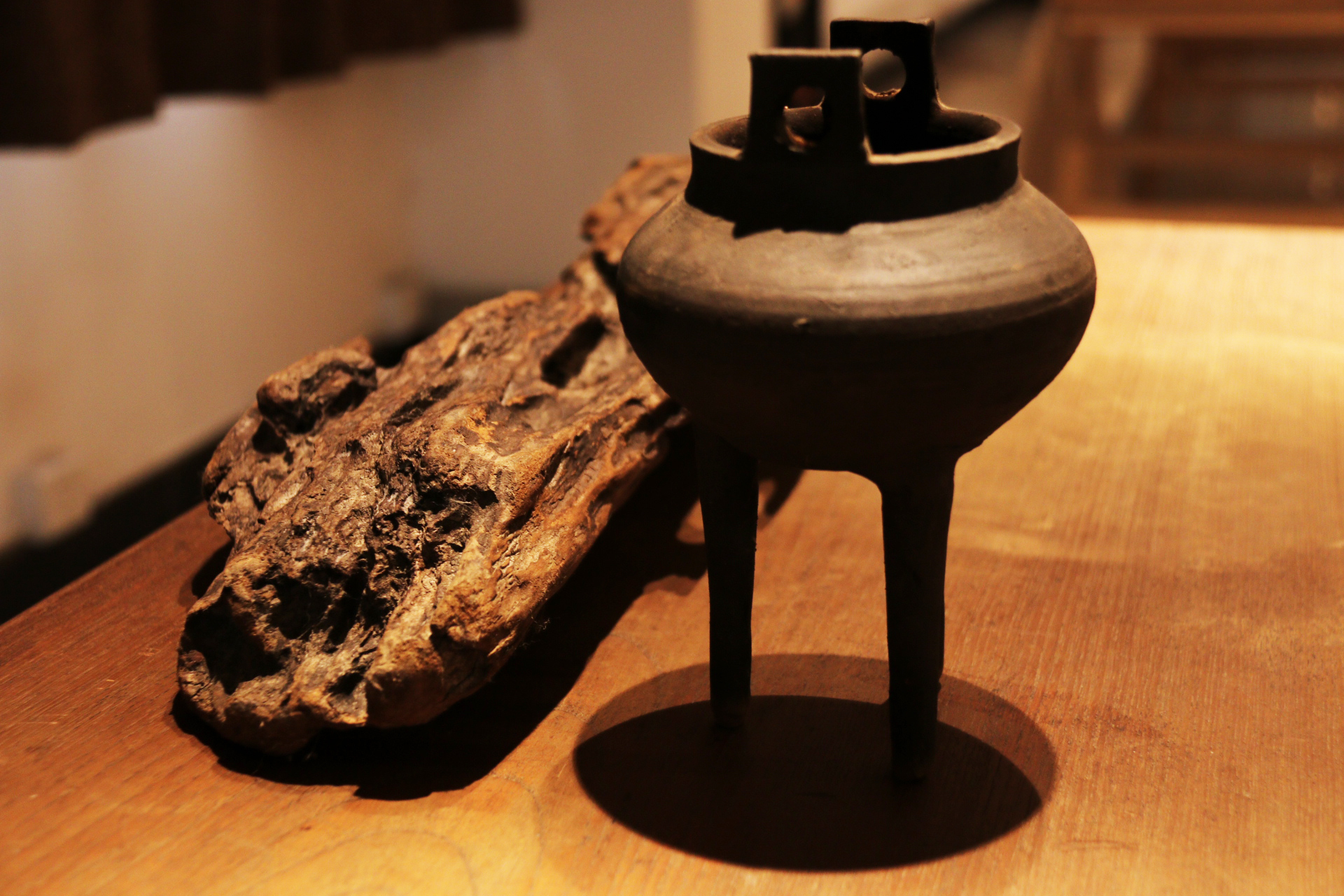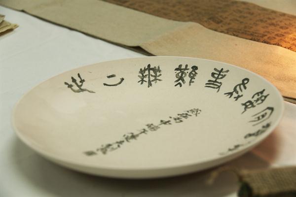 装裱作品分为字画修复与新画装裱。指导老师江杰老师说:“修复过程比较复杂,任何一步都不能错。”修复(画)共有五张作品,其中修复的画心都是从古玩市场淘过来的。字画修复总体可分为四个步骤:洗、揭、补、全,洗为清洗,揭为揭覆背纸和命纸,补为修补残破的地方 ,全为全色(补色)。这一组的展览作品制作了近一个学期,每一张修复画都要花一个月左右的时间来做。装裱部分皆按传统手工书画装裱,裱件干净清爽,笔挺柔软,清新雅致。陶艺由泥土拉坯成型,晾至七分干,接着修坯,上釉,最后烧造而成。短短一句话概括了过程,但实际却并不简单,前后花时几周甚至更长。在傅菲菲老师与郑源雷老师的指导下,陶艺组做了许多精美的作品,有各种各样的杯子,以脚胎、青瓷为主;还有小巧的泥片,样子方方正正的,似个薄薄的方盘,以刻划花为主要纹饰,再施上晶莹的釉水,烧造出来的样子十分精致。作品中还有各式贯耳瓶,器形都是形态不一的。这些作品中比较有代表性的是俞骏昊同学的“鹰首壶”,仿东晋越窑的器型,鹰首、鹰爪、鹰尾都做的相当逼真,精湛的技艺获得了围观者的好评。
