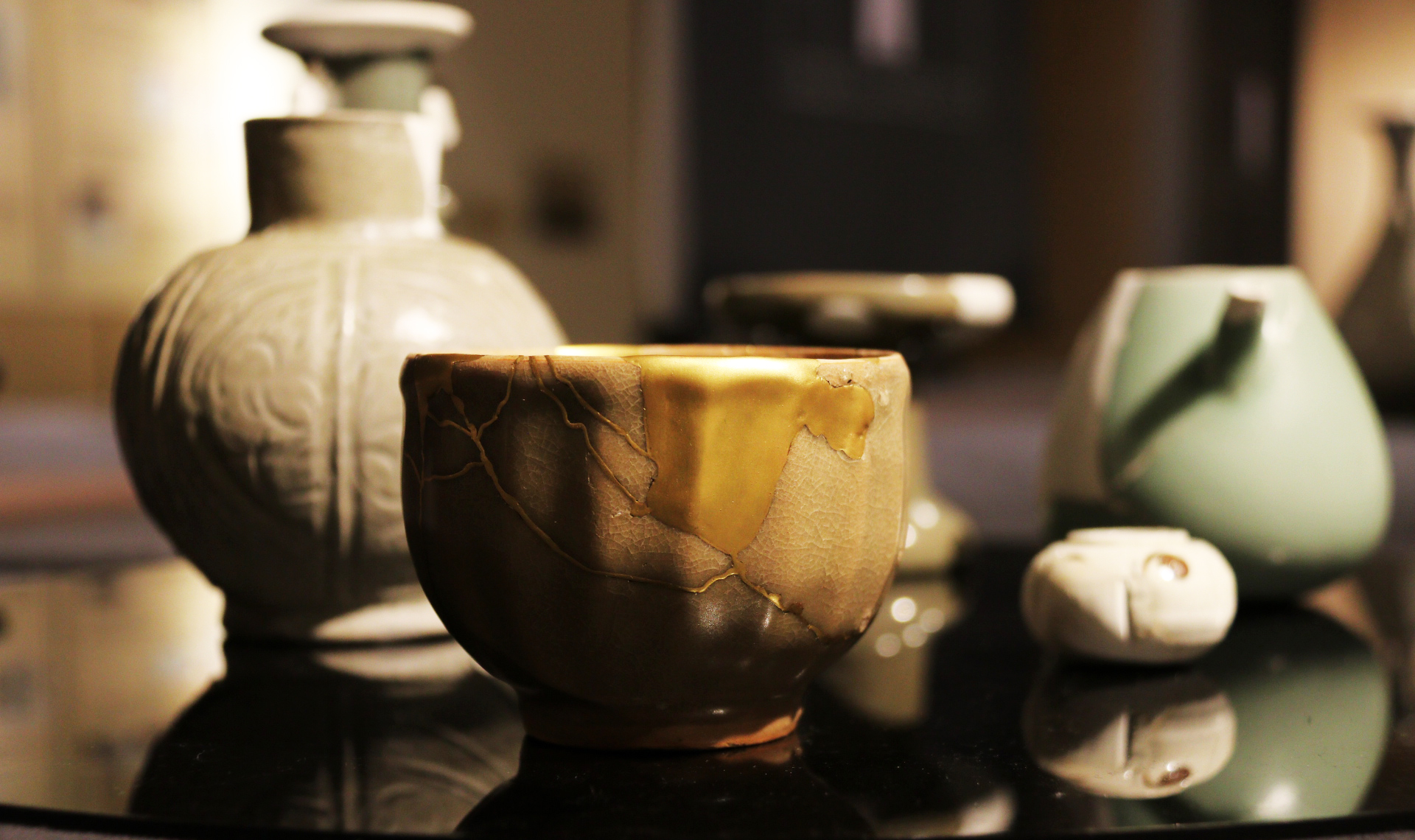 瓷器修复组的同学在指导老师朱伟洁、徐佳颖的指导下,取得了“妙手回春”的成果。同学们的作品展示了三种修复手法:石膏修复,大漆修复,金缮修复,石膏修复最为基础,金缮与大漆修复是起到一定美化作用的艺术性修复。首先根据功能用石膏或瓦灰等可塑性强的材料来塑造瓷器造型,打磨平滑,使其硬度、光滑度接近器物本身,再以黑漆、金粉、银箔等材料加以修饰。
