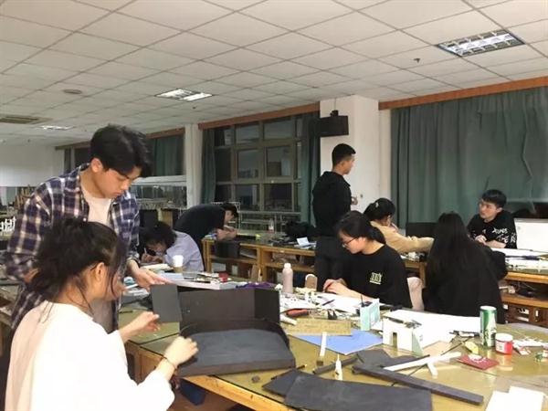 李昌国、吴放、田旻等教师在指导学生制作道具