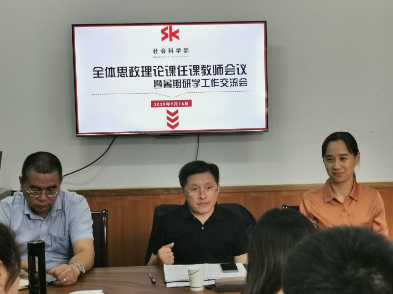 马向东在讲话中带领全体教师重温学习习近平总书记在《求是》杂志上的重要文章《思政课是落实立德树人根本任务的关键课程》,充分肯定社会科学部以及承担着思政课程教学的专兼职教师在学校人才培养全过程的重要性,转达了校党委领导对社会科学部和全体思政科教师的关怀与重视。他指出,面对新时代,机遇和新挑战并存,全体思政课教师要在政治立场、政治方向、政治原则、政治道路上始终同以习近平同志为核心的党中央保持高度一致,力争做到政治要强、情怀要深、思维要新、视野要广、自律要严、人格要正,做一名真正经得起道德锤炼和困难考验的思想政治理论课教师。