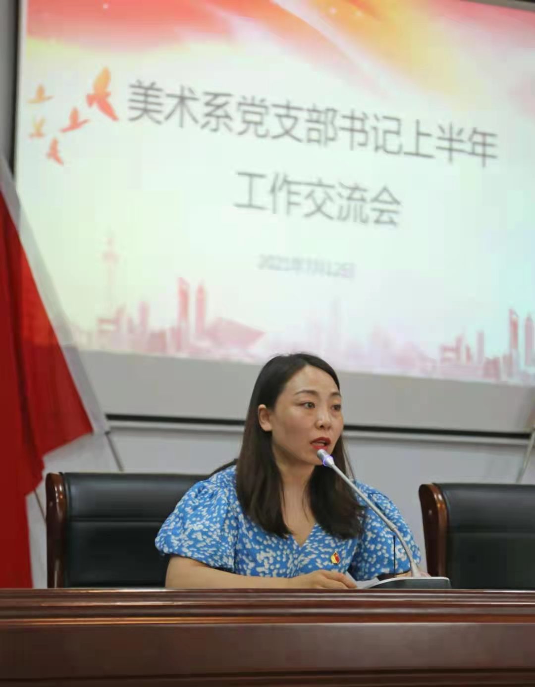 在纪念馆会议室内,美术系党总支还开展了上半年党史学习教育工作交流会,会议由美术系党总支副书记顾才铭主持。美术系党总支书记汪琳就上半年党史学习教育情况进行了总结并作了下半年工作部署。