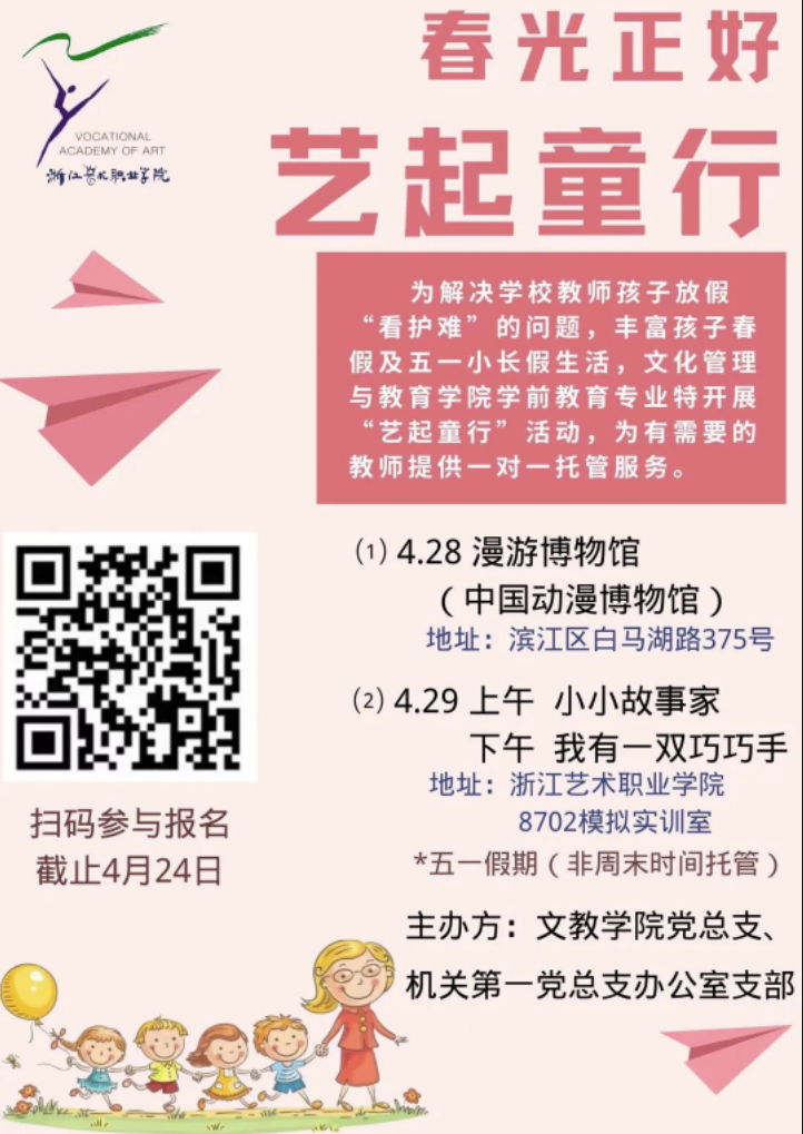 为解决学校教师孩子放假“看护难”问题,减轻教师负担,丰富孩子春假及五一小长假生活,文教学院党总支、机关第一党总支办公室支部带领文教学院学前教育专业于4月28日起开展春假及五一小长假托管志愿者服务活动(主要针对3-6岁学龄前儿童和小学生),为有需要的教师提供一对一春假托管服务。