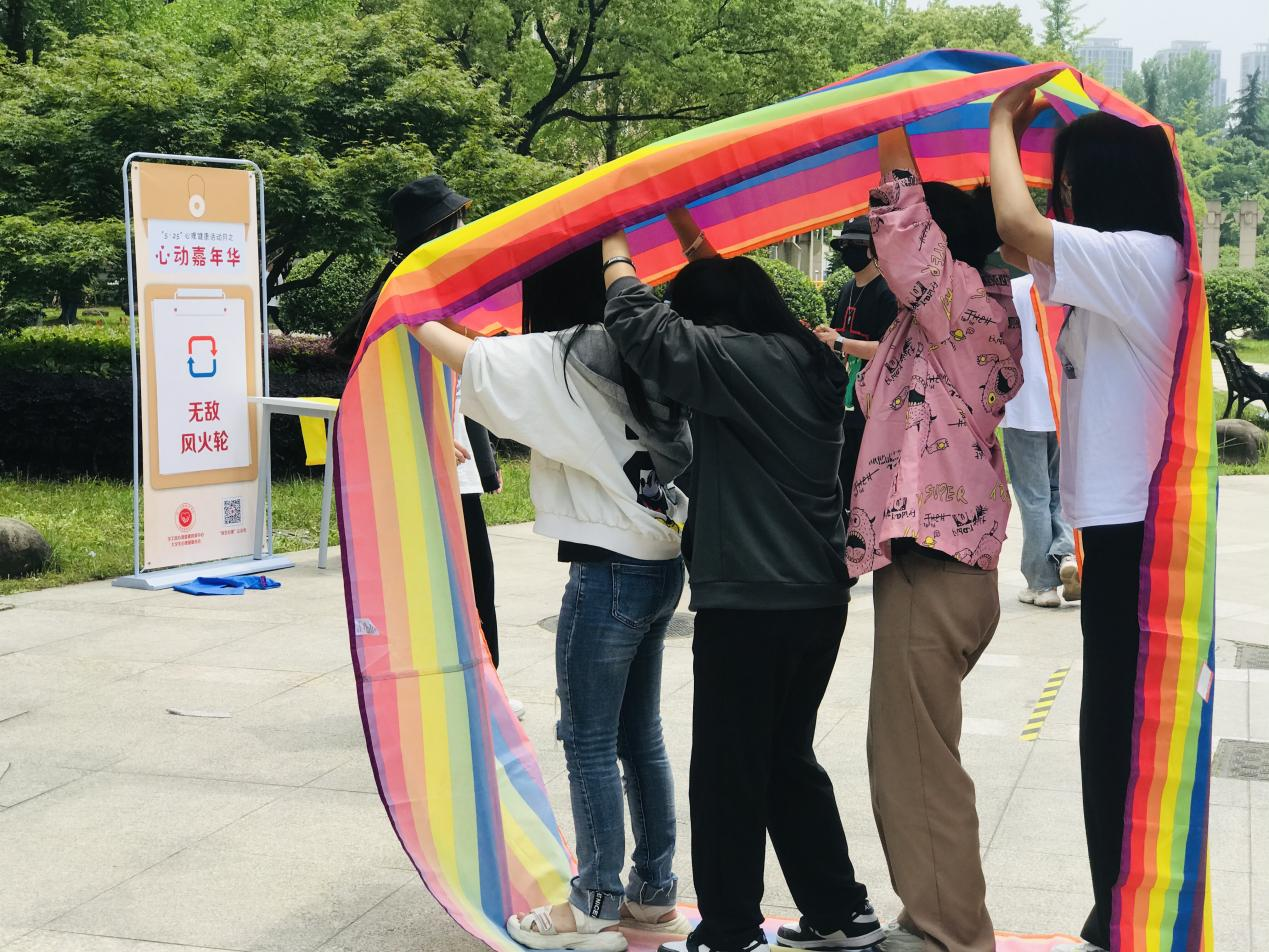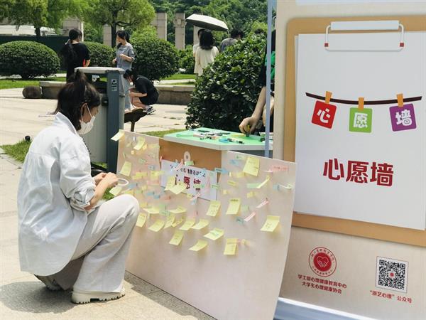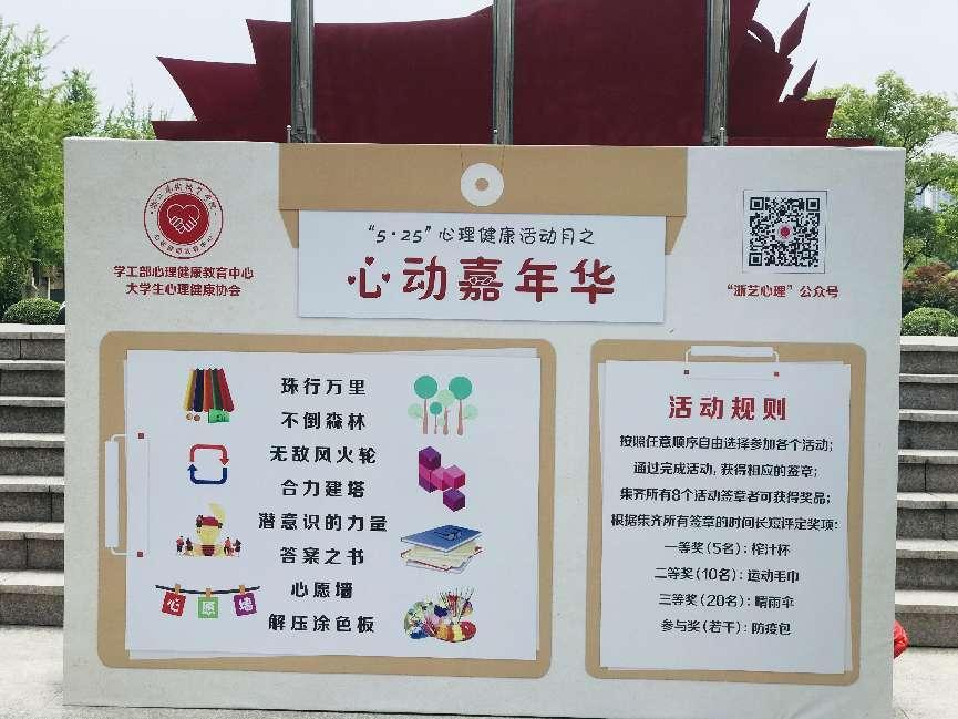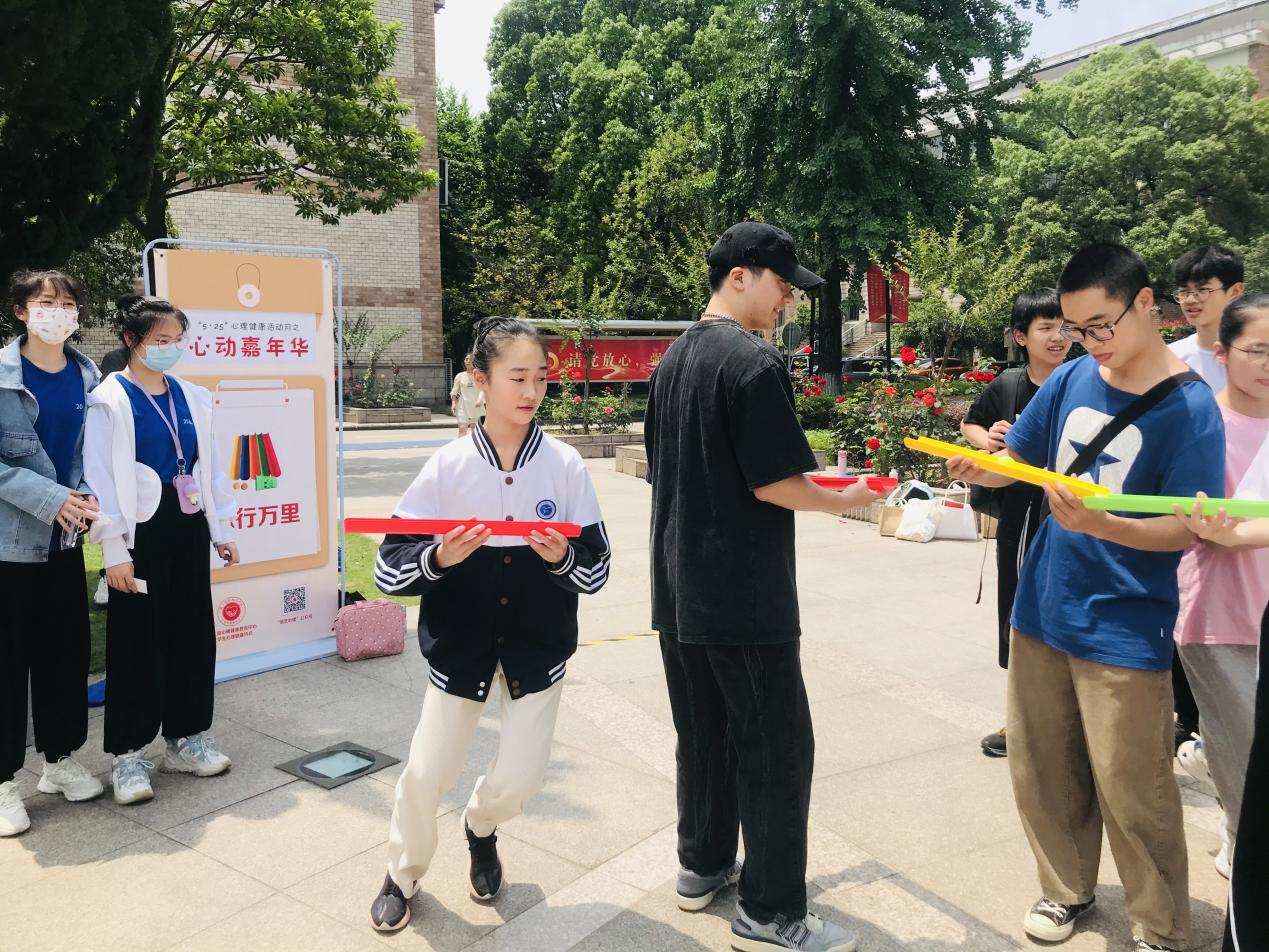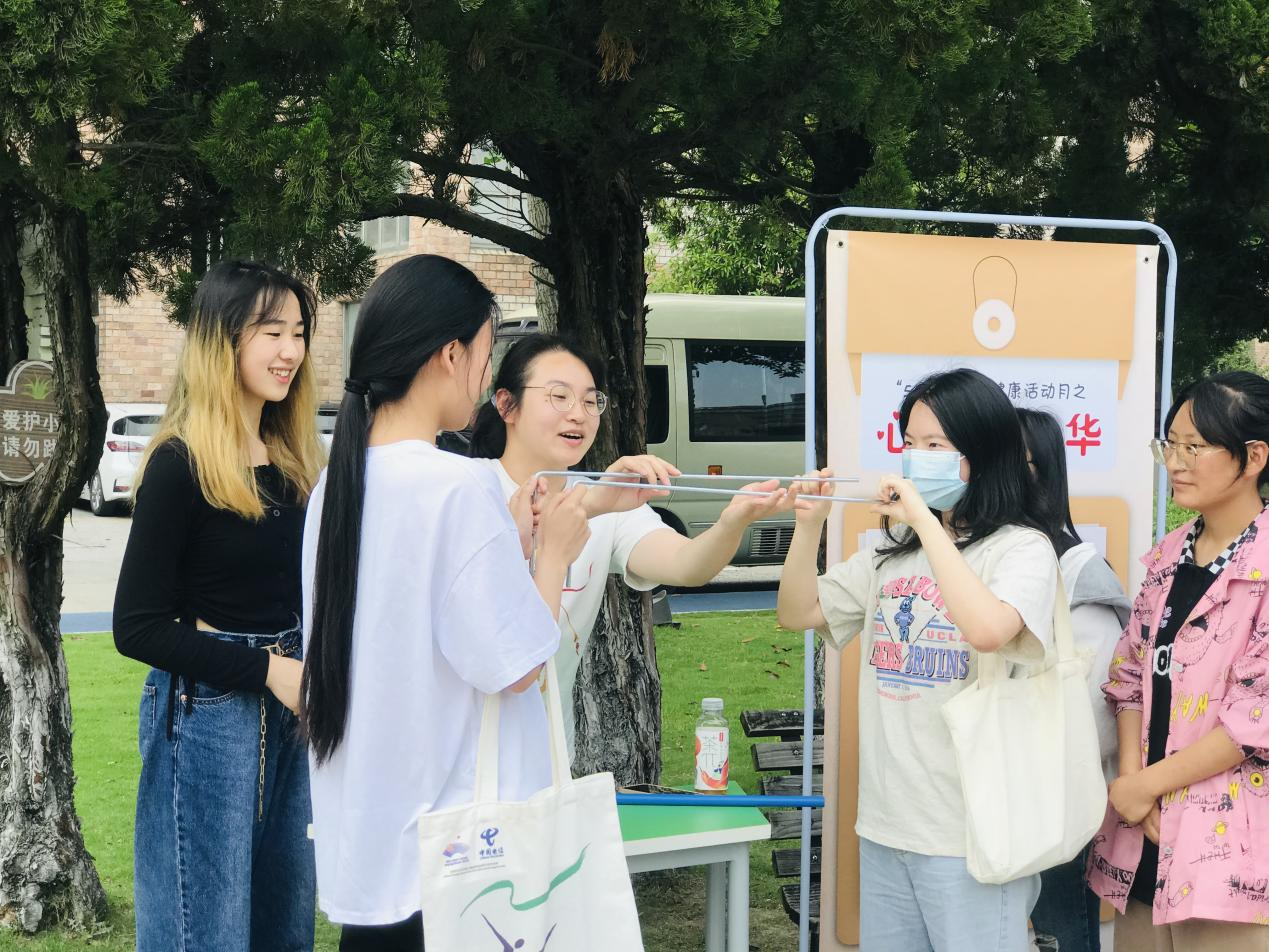 5月25日,5•25心理健康月特别策划“心动嘉年华—心理游园会”在学校8号楼前的中央花坛热烈开场。同学们手持“游园通关卡”,有序闯关。本次心动嘉年华一共下设8个子活动,内容涉及团队合作和个人体验两部分,全校约350名同学参与了此项活动,活动现场热闹非凡。