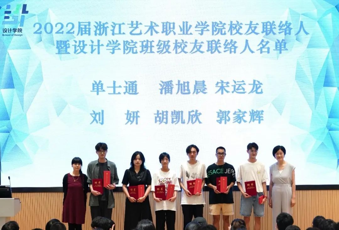 校产学合作处校友工作主管余绿筠,设计学院副院长何佳玮共同为第二届校友联络人颁发聘书。