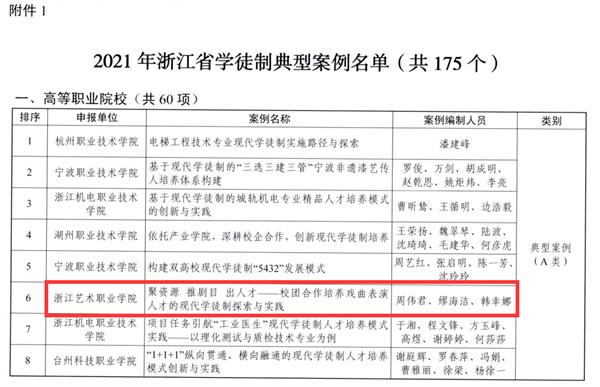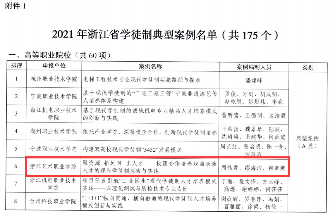 浙艺戏曲表演专业从2007年开始与浙江小百花越剧团携手开展校团合作现代学徒制戏曲人才培养的改革探索,开办了第一个现代学徒制小百花越剧班。2014年,《校团合作培养戏曲演员的“现代学徒制”探索与实践》获得职业教育国家级教学成果奖二等奖。2018年9月戏曲表演专业入选教育部第三批现代学徒制试点专业。在多年的现代学徒制人才培养实践中,学院在校团合作共建推进产教深度融合方面积累了丰富的经验,此次入选2021年浙江省学徒制典型案例是我校戏曲表演专业现代学徒制研究取得的一项重要成果,有力推进了学院“双高”建设。