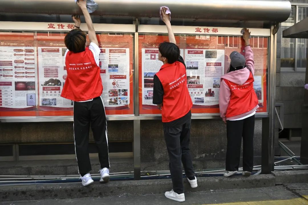 同学们认真清理着校园宣传栏上的灰尘,使原本有些许黯淡的宣传栏变得明亮通透、焕然一新。“艺光印象”志愿服务队中“小雷锋”们用实际行动弘扬“奉献、友爱、互助、进步”的志愿者精神和新时代雷锋精神。