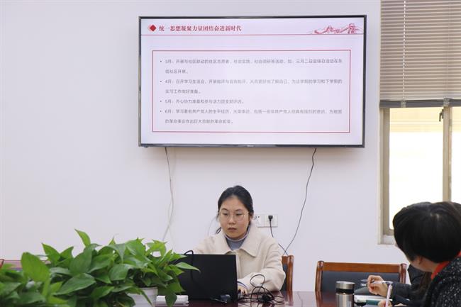 为深入学习宣传贯彻党的二十大精神,3月1日,手工艺学院开展党章学习小组“学”风引领行动汇报会。会议由学生党支部书记胡墨智丽主持,手工艺学院党总支专职副书记王筱芽,组织员钱杏芬,辅导员戚幸怡,各班党章学习小组组长参会。