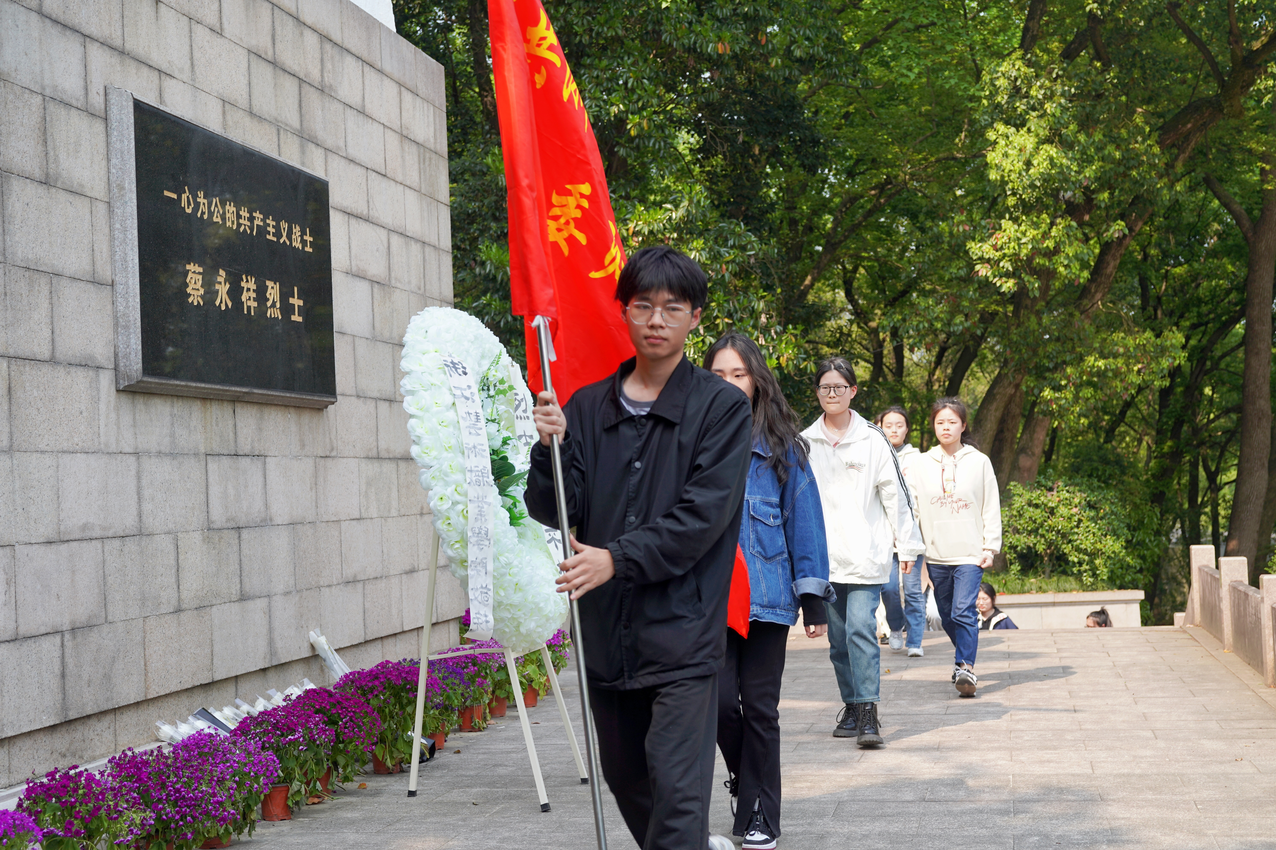 沿着青石板路上行,穿过青松翠竹,同学们情不自禁地追思起那些见义勇为、不畏牺牲的烈士们。往上攀爬,映入眼帘的是一座伟岸的雕像,记录了烈士蔡永祥同志牺牲时的英勇身姿,其身后红墙上“为有牺牲多壮志,敢叫日月换新天”赫然醒目。
