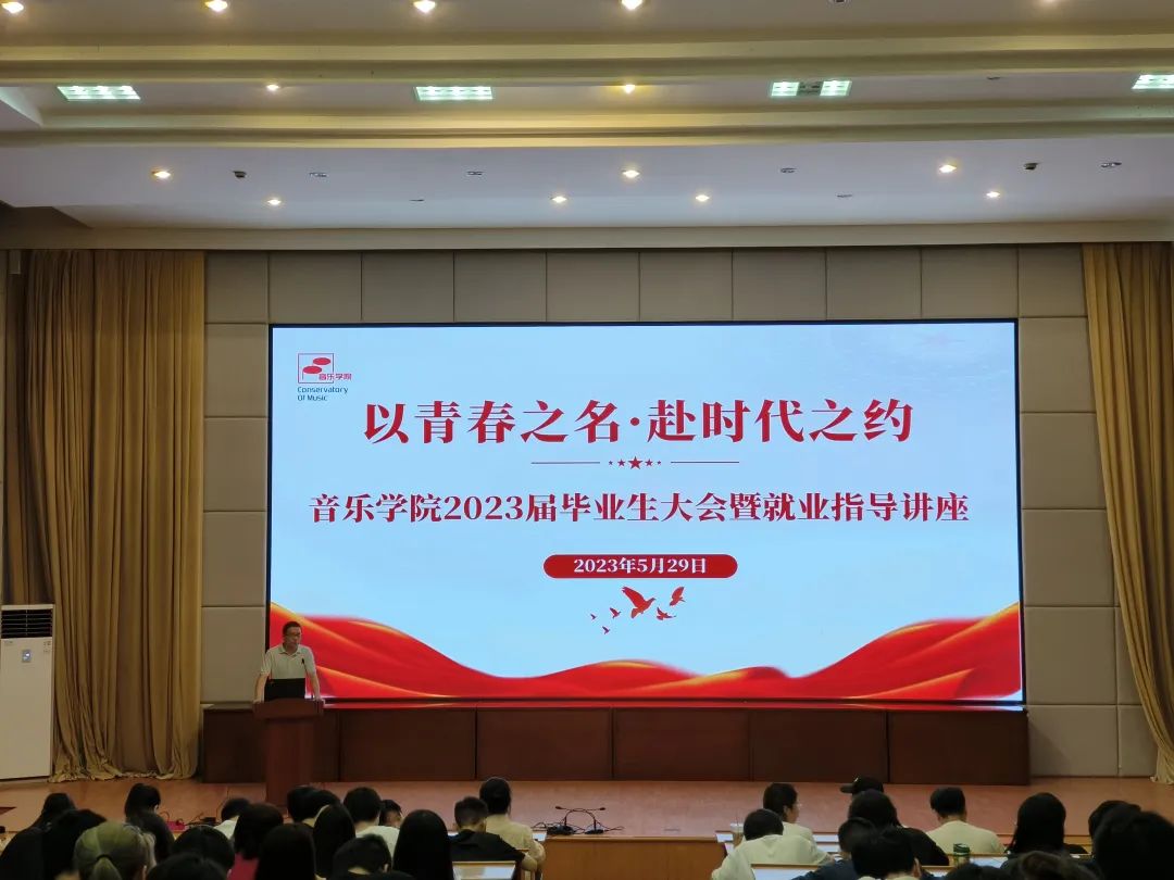 为推进毕业生工作顺利进行,5月29日,音乐学院在图信中心召开“以青春之名 赴时代之约”2023届毕业生大会暨就业指导讲座。音乐学院党总支专职副书记刘梦伟、学工部招生就业办陈涛、音乐学院辅导员陈宏出席,2023届全体毕业生参加。会议由辅导员王一雯主持。