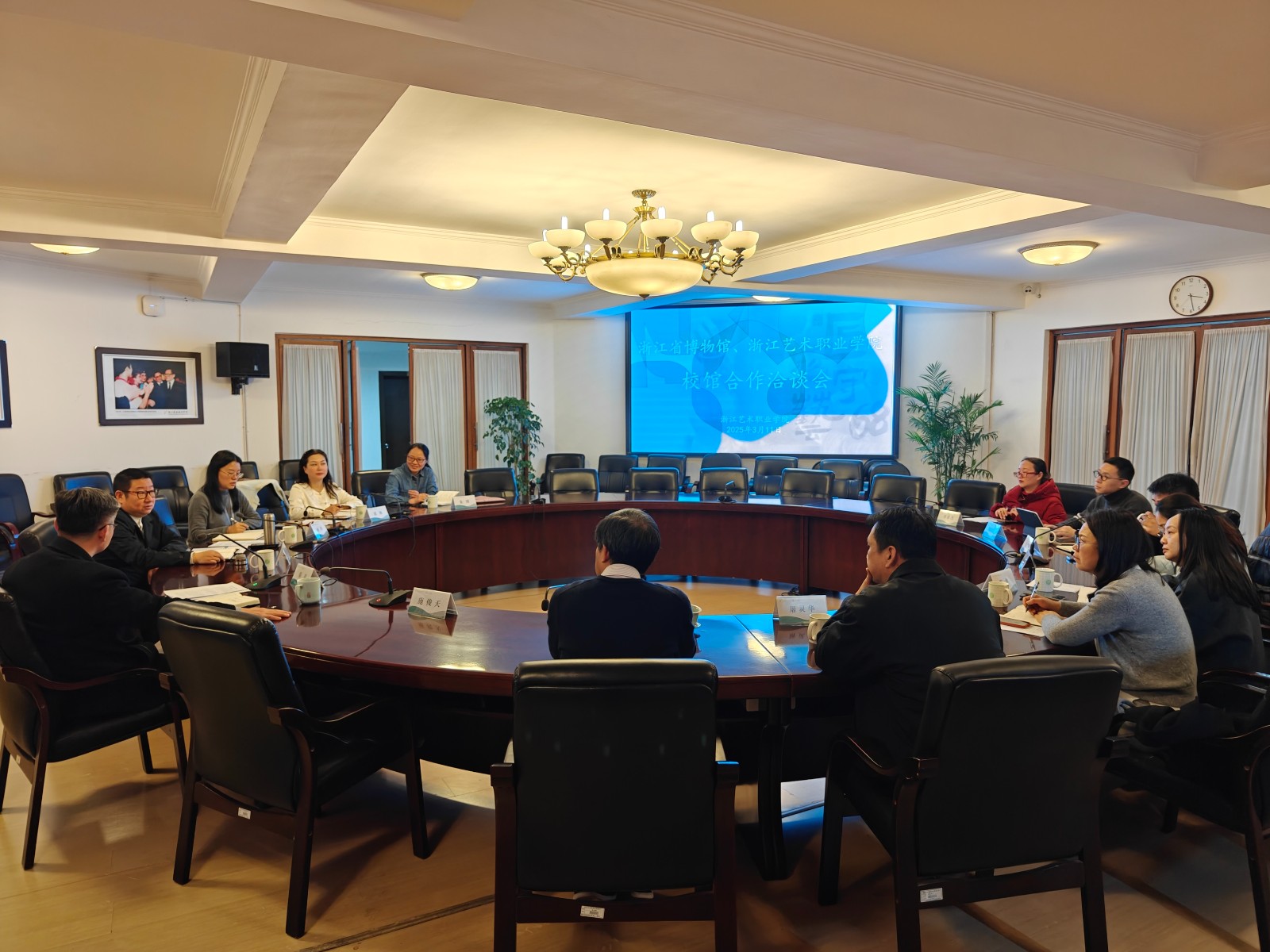 3月11日下午,浙江艺术职业学院与浙江省博物馆校馆合作洽谈会在学校三楼大会议室举行。浙江省博物馆党委书记、馆长纪云飞,学校党委班子成员薛亮、施俊天、徐芳,以及浙江省博物馆党委专职副书记杨玲、经营管理部主任蒋琳、经营管理部干部朱璆和学校产学合作处、手工艺学院领导班子出席。