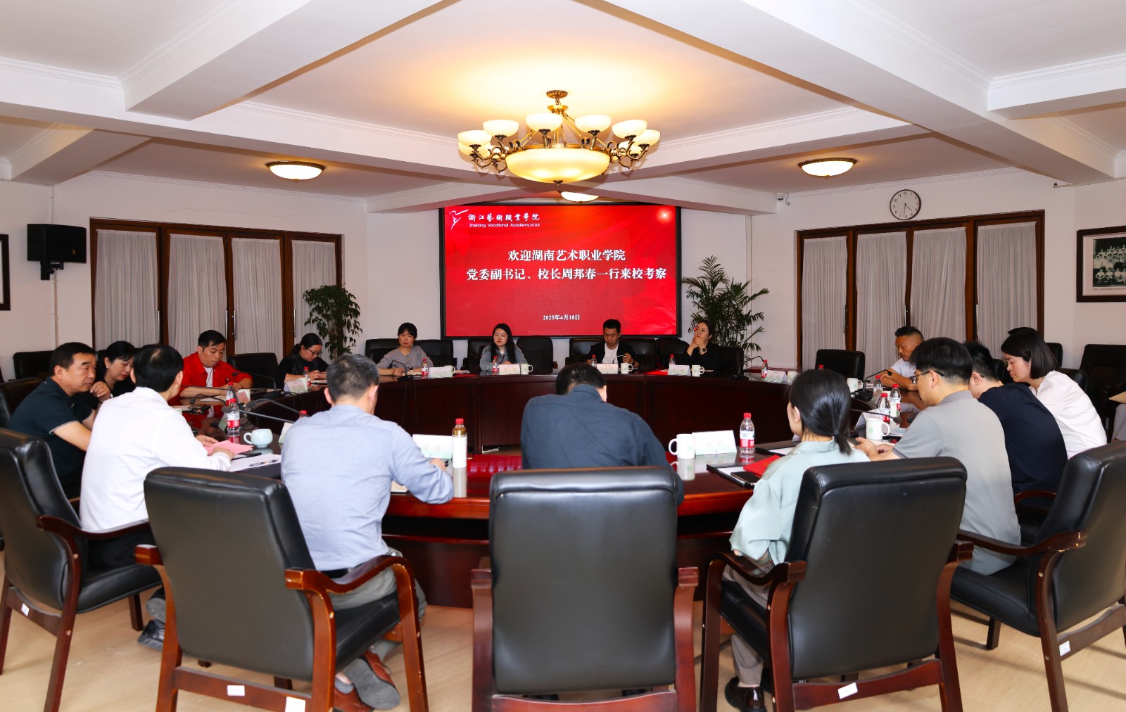 4月10日,湖南艺术职业学院党委副书记、院长周邦春一行来我校调研,我校校长、党委副书记施俊天接待并交流座谈。