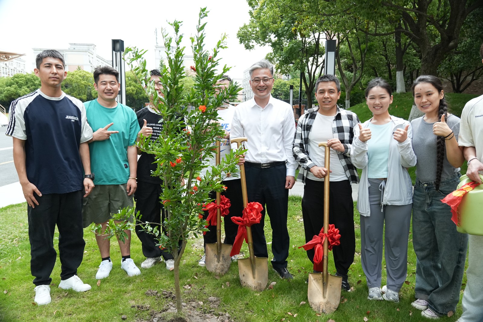 活动最后,在报告厅门口的民族林种植区,老师与同学们一同挥锹铲土、浇水灌溉,种下一株株象征团结石榴树。培土时的专注,浇水时的期待,同学们每一个动作都饱含着对未来的憧憬。石榴树苗扎根沃土,正如浙疆情谊在交流中不断生长、愈发深厚。它象征着各民族像石榴籽一样紧紧相拥的团结精神,也寓意着 “我爱浙疆・基层文化员” 项目在边疆播撒的文化种子,终将长成枝繁叶茂的大树。这场温暖的相聚,不仅是浙疆两地文化交融的生动写照,更让每位学员将 “扎根边疆、服务基层” 的信念深植于心。相信在未来,他们定能带着母校的祝福与期望,在文化润疆的道路上绽放出更加绚烂的光彩,让浙疆同心的石榴花开遍边疆大地。