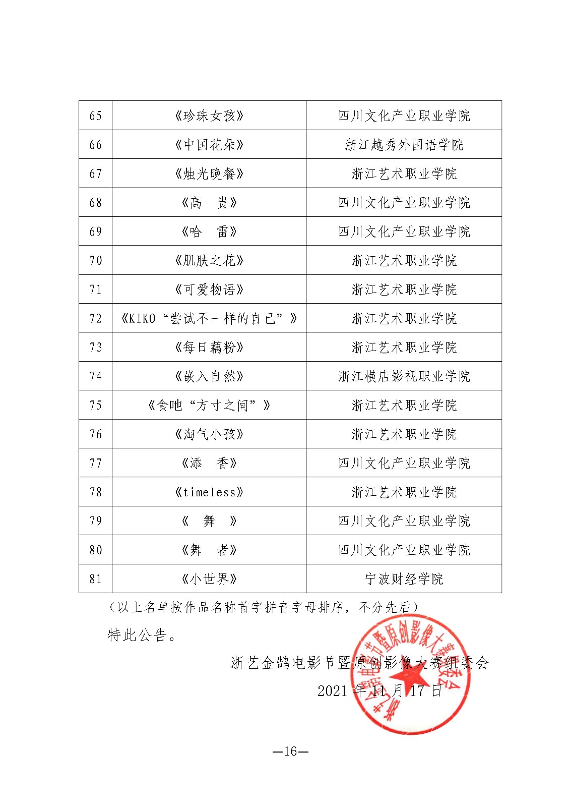 由中国艺术职业教育学会主办的第四届浙艺金鹄电影节暨原创影像大赛于2021年11月20日—11月27日在杭州举行。本次大赛总共收到参赛作品1129件,其中短片单元395件、剧本单元166件、短视频单元219件、摄影单元349件。经专家评审组初评后,共有303件作品入围,入围率27%。现名单公示完成,最终入围名单如下,特此公告。