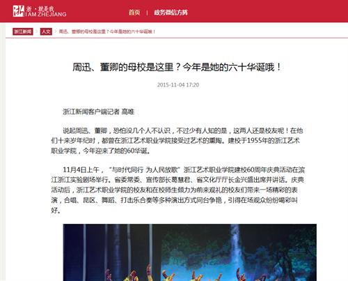 11月4日,浙江艺术职业学院举办建校60周年校庆大会暨纪念演出,浙江卫视、中国文化报、中国教育报、钱江晚报、杭州日报、都市快报等传统媒体,和浙江在线、新浪浙江、腾讯大浙网、浙江新闻客户端、杭州网等新媒体都进行了相关报道,向社会各界传递了浙艺办学理念、特色、最新成果及明星校友等信息,扩大学院影响,为学院口碑和美誉度添彩。