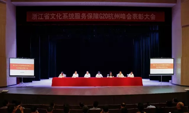 会上,宣读了浙江省文化厅关于表彰服务保障G20杭州峰会工作先进集体、先进个人的决定。32家单位和部门被授予“浙江省文化系统服务保障G20杭州峰会工作先进集体”,217名同志被授予“浙江省文化系统服务保障G20杭州峰会工作先进个人”。