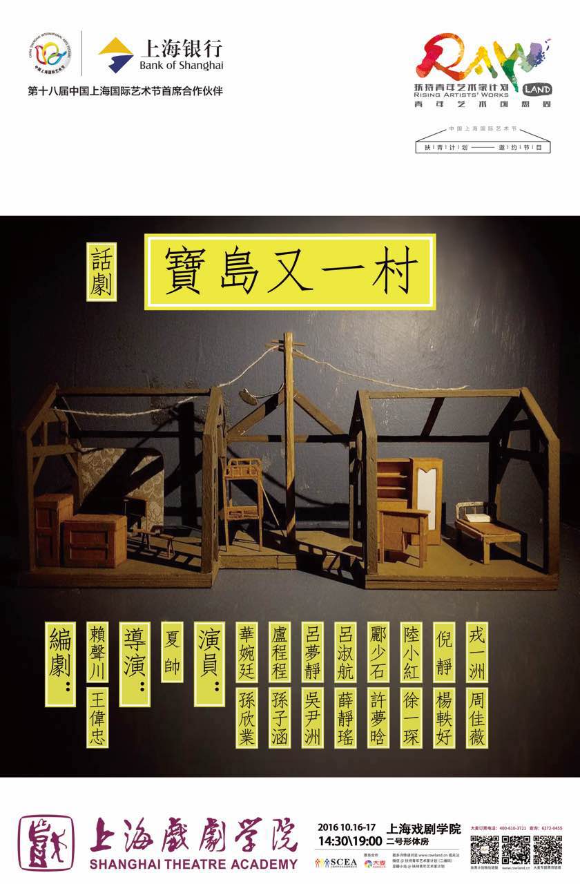 10月16日至10月17日,浙江艺术职业学院戏剧系2012级表演艺术专业五年一贯制班的16位同学在第18届上海国际艺术节青年创想周展演活动上,为上海观众带去了由夏帅老师导演的话剧《宝岛又一村》。