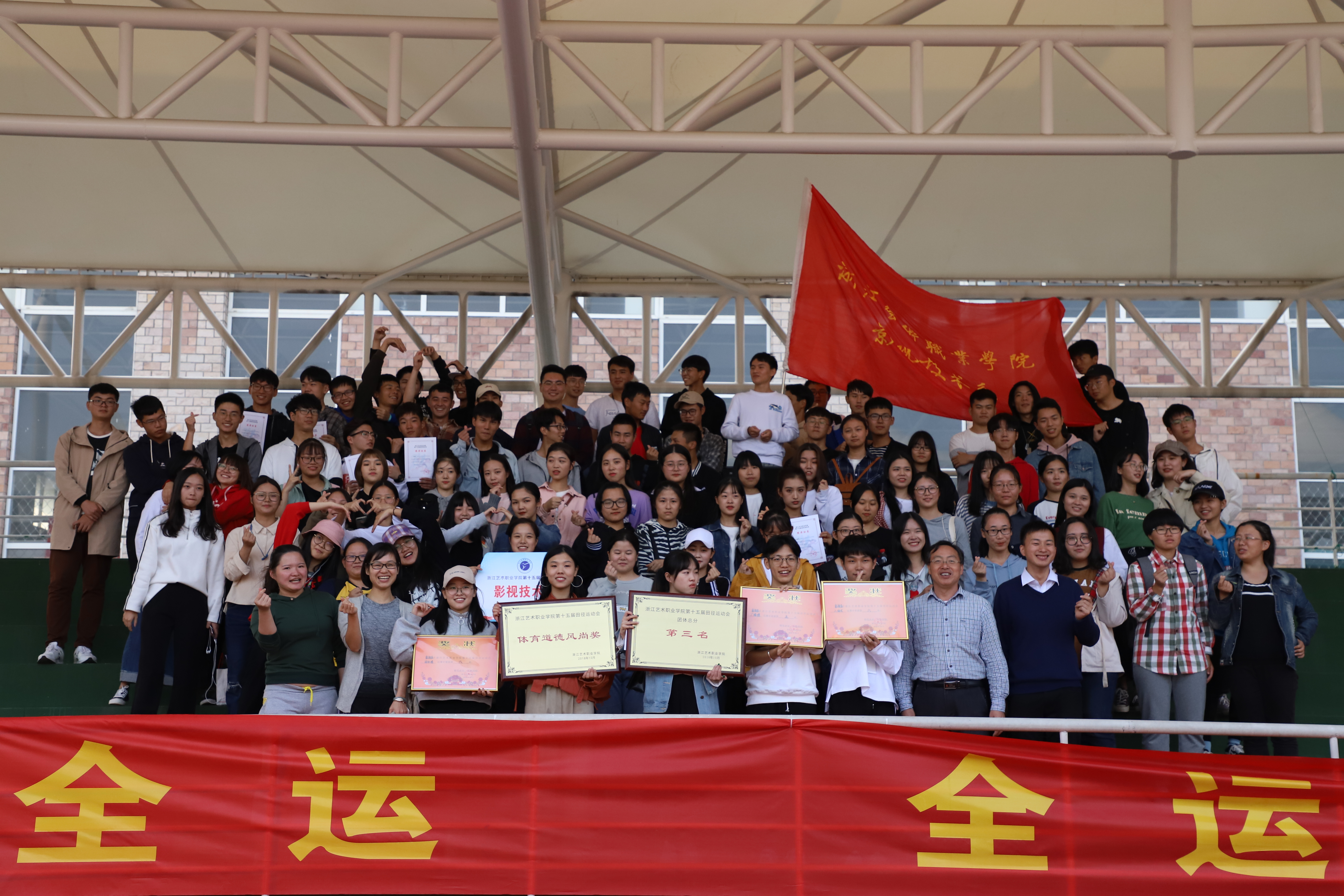 伴随着温暖的阳光,运动会胜利闭幕了。我们见证了运动员的拼搏努力,裁判们的严谨公正,志愿者的辛勤付出。我们被加油呐喊声所感染,被一幕幕同学们互相帮扶的情景所感动。这个秋天,这个下午,浙艺人在绿茵场上留下了属于他们的风采。