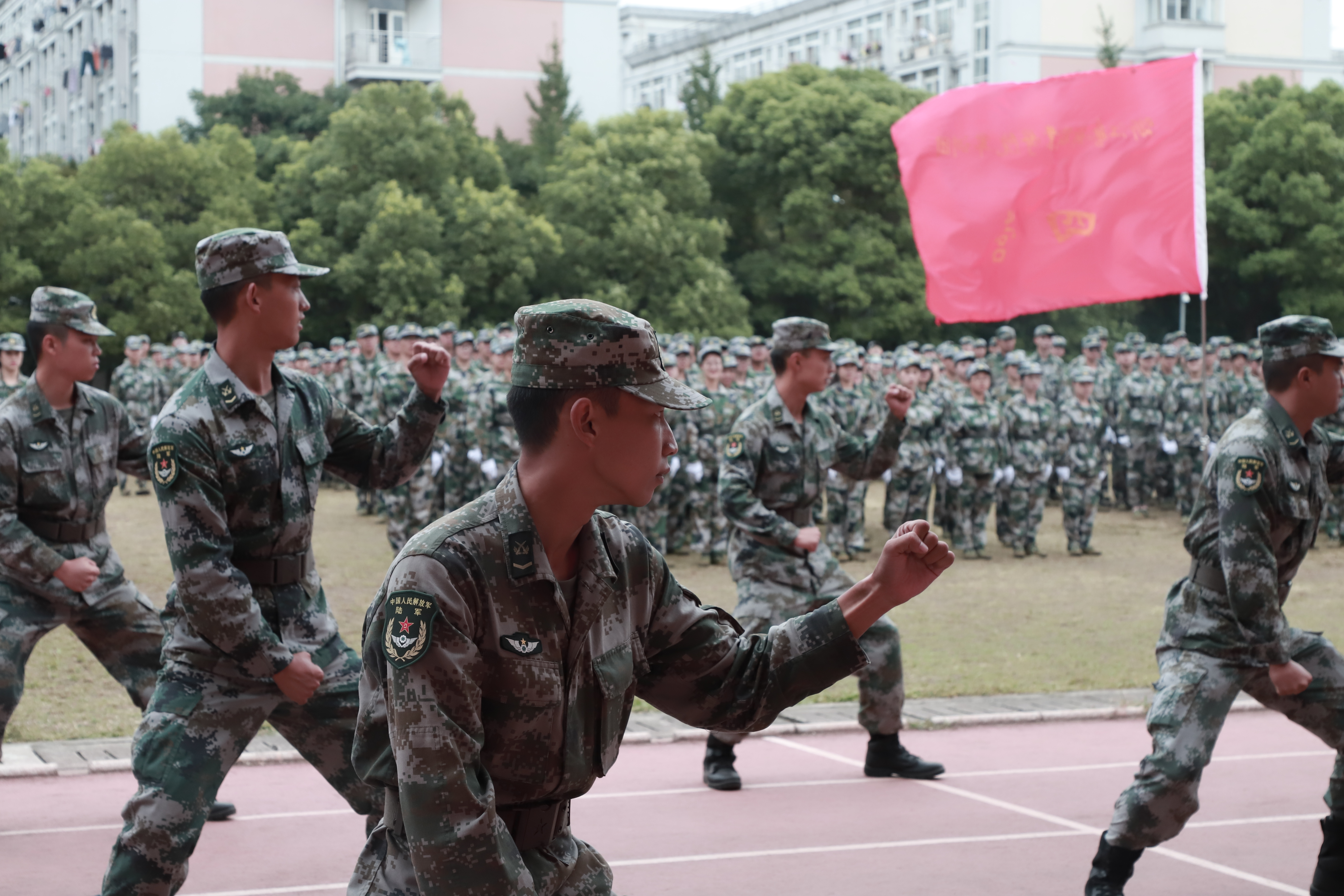 各营连新生进行会操表演,经过13天刻苦训练,他们步伐整齐,精神抖擞,目光炯炯有神,展现了浙艺学子的青春风采和精神风貌。