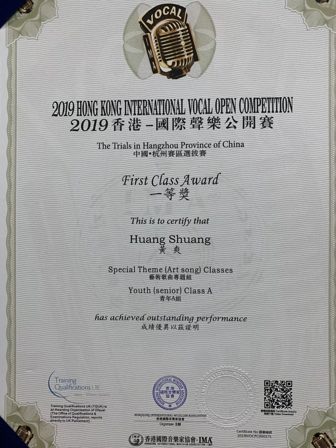 2019香港国际声乐公开赛杭州赛区比赛艺术歌曲专题青年A组一等奖第一名;