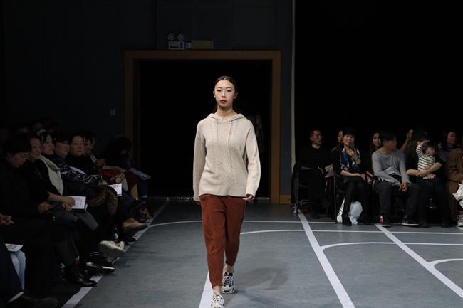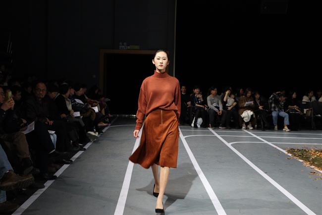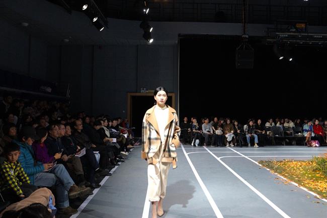音乐转换,服装的风格也变暖了。毛衣、风衣、棉衣……棕色的冬日暖衣取代了先前的严肃,绒绒的冬款让清冷的模特也多了一份温情。与场地内银杏叶相互映衬,他们就是在5号楼中心花园的小径上,在银杏叶的陪伴中完成了一次次汇报演出。大屏幕上的VCR也记录了他们浙艺时光,从课堂上的每一次疲惫练习到奔赴各地秀场绽放属于自己的美,时光流逝,他们在成长。