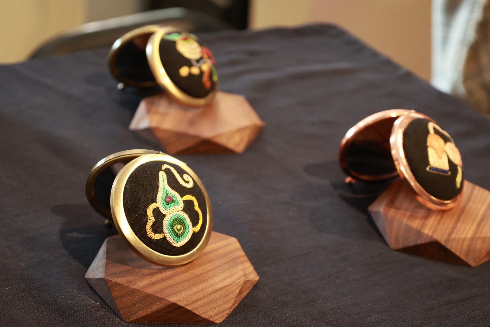 蓬莱仙境作品以梳妆镜作为载体,用黑底布作为绣面背景,运用锁链绣进行绣制,搭配缤纷的绣线色彩和金银线的线性装饰,所绣内容为中国传统的暗八仙形象,表达了吉祥长寿的寓意,代表了中国道家追求的精神境界,是传统刺绣作品中的经典题材。