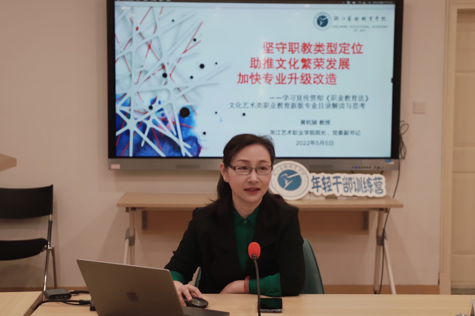 5月5日傍晚,院长、党委副书记黄杭娟以《坚守职教类型定位,助推文化繁荣发展,加快专业升级改造》为题作专题讲座,年轻干部训练营全体学员在现场进行专题学习,按照疫情防控有关要求,学校全体中层干部、专业带头人、教研室主任、骨干教师等在线上参加学习。