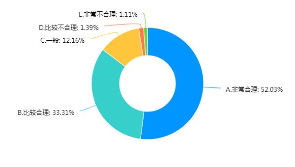 专业课程开设的合理性。52.03%的学生认为很合理,33.31%的学生认为比较合理,认为一般、不太合理或很不合理的学生分别占12.16%、1.39%、1.11%。