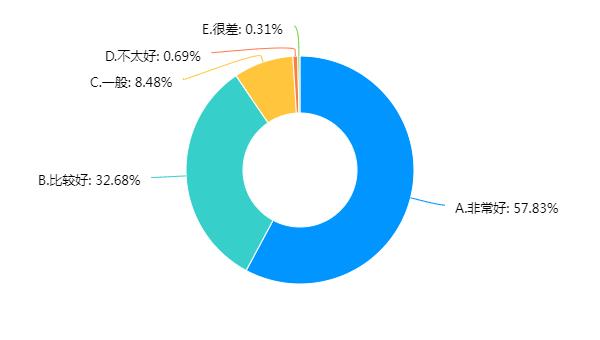 课堂教学及实践教学的总体质量。大部分学生非常认可学校课堂教学及实践教学,有53.46%的学生认为非常好,33.9%的学生认为比较好。认为一般、不太好或很差的分别占11.25%、0.9%、0.49%。