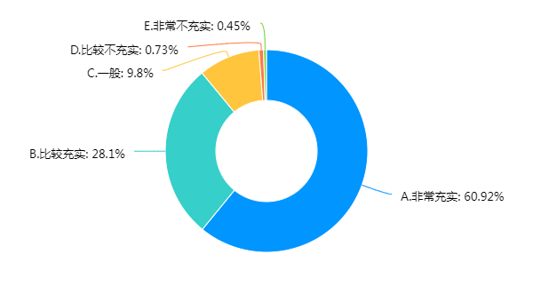 本学期学习内容的充实性。认为非常充实、比较充实的学生占比分别为60.92%和28.1%,比上一学期略有提高。认为一般、不太充实或很不充实的学生分别占9.8%、0.73%、0.46%。调查结果反映出大部分专业课程开设合理性较强,学生学习满意度较高。