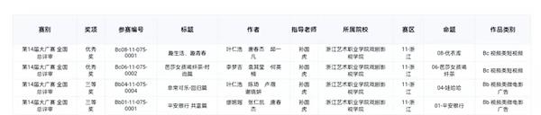 浙艺学子积极报名参赛,与各高校硕本专学生同台竞技,在经历了学校初评、赛区评选、全国总评审的层层严格选拔后,4项参赛作品在1869所高等院校,共计74万件作品中脱颖而出,在所有等级奖中是唯一一所获奖的高职院校,让我们一起来看看吧!