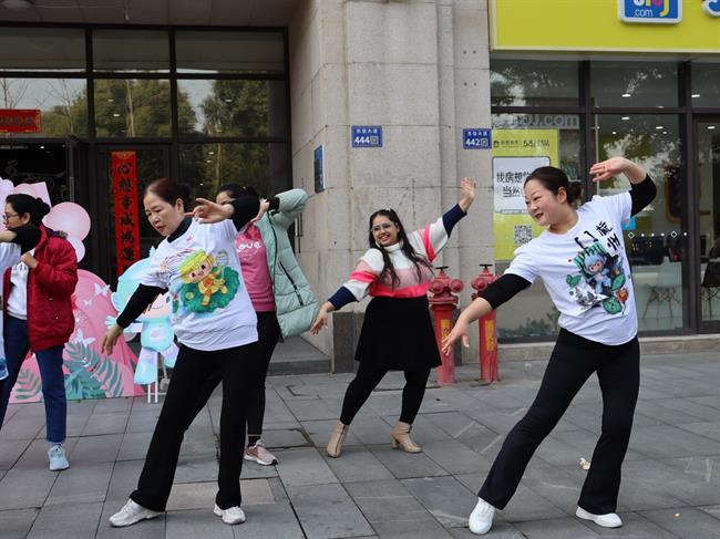 广场舞老师手把手教学,耐心示范,教学方式灵活,交流气氛热烈,外国友人们现学现练,受益匪浅,大家一起“舞”动亚运,展现青春风采。