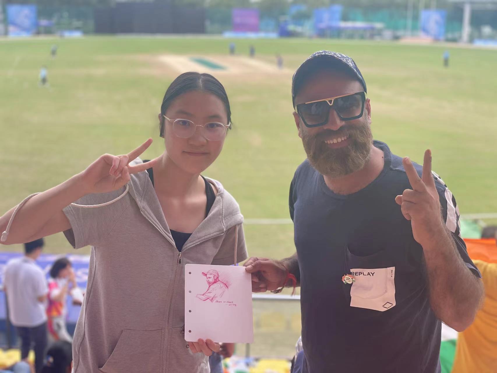 10月3日,童赵楠前往比赛现场。随着比赛的进行,她用心感受着每一个瞬间,用敏锐的观察力捕捉选手们的动作和场景,在画板上迅速描绘出比赛场景以及运动员们比赛的精彩瞬间。她的画作充满了动感和生命力,生动地展现了运动员们在赛场上的拼搏精神和团队合作精神。最后,她将一幅幅精美画作送给了外国观众,得到了他们的赞赏。