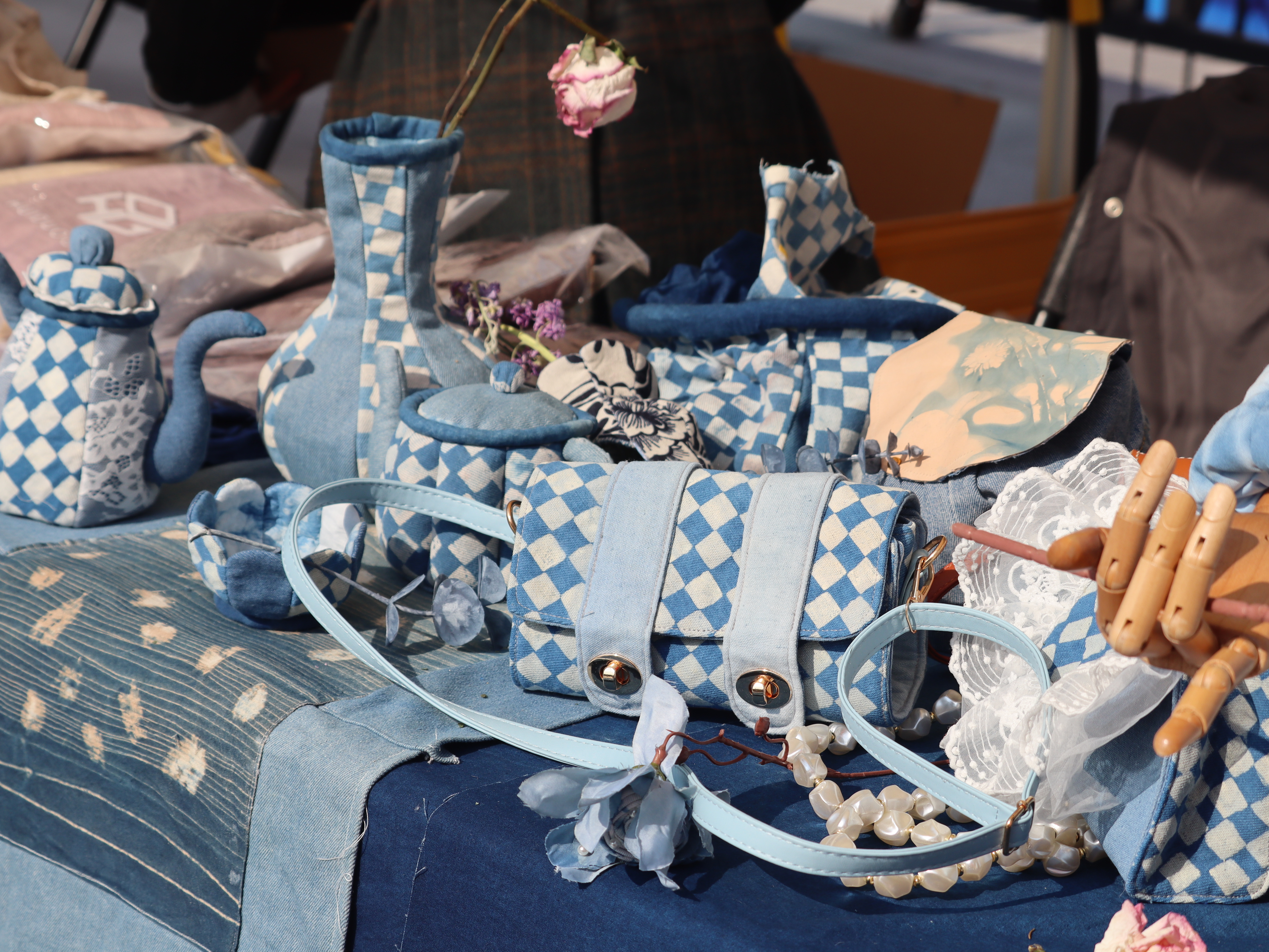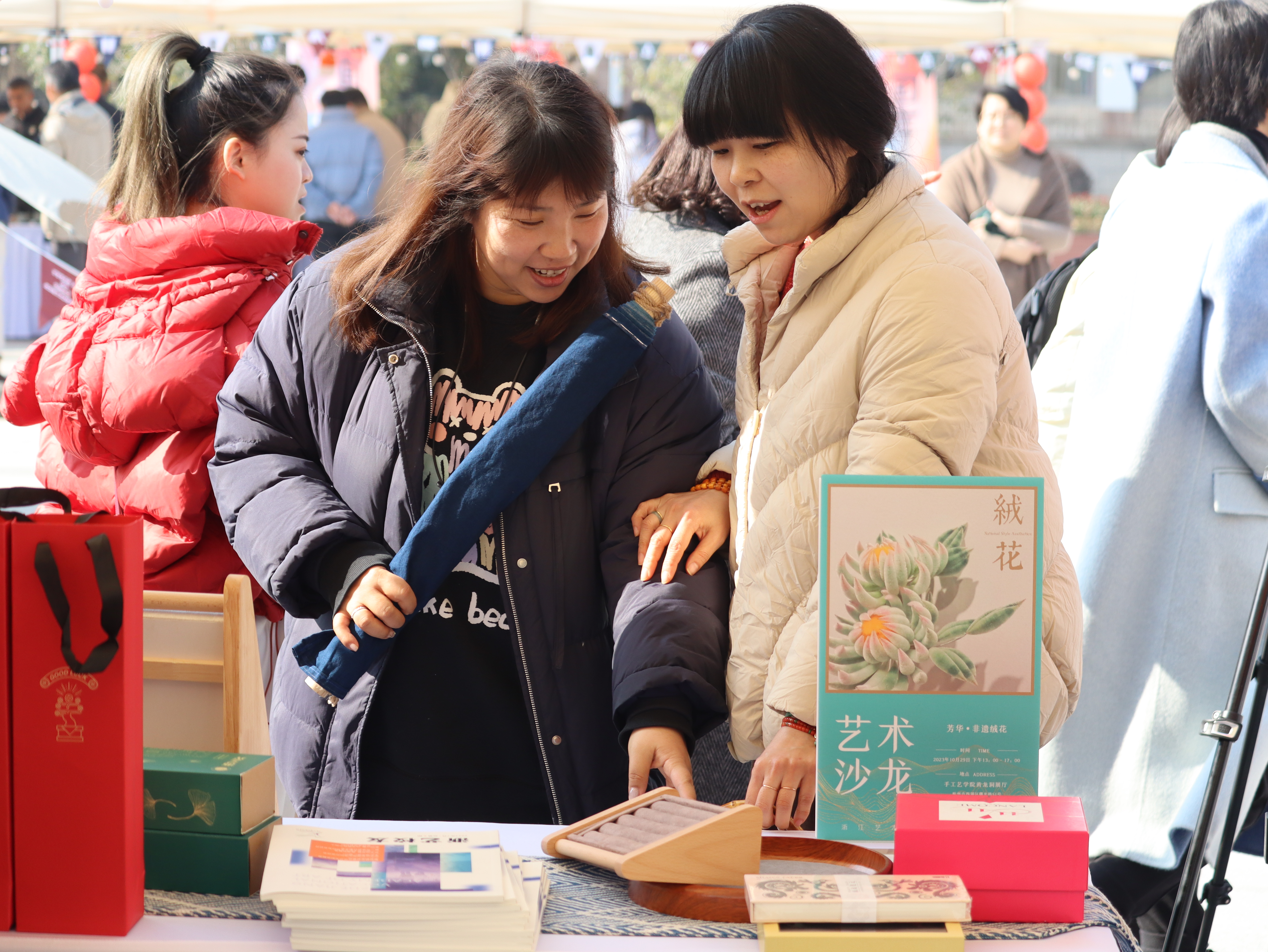 参加此次市集活动的师生结合课堂教学,精心打磨设计作品,将一件件充满艺术创造力和生命力的手工艺教学成果展示出来,让非遗传统技艺在文创产品中焕发新的生机。