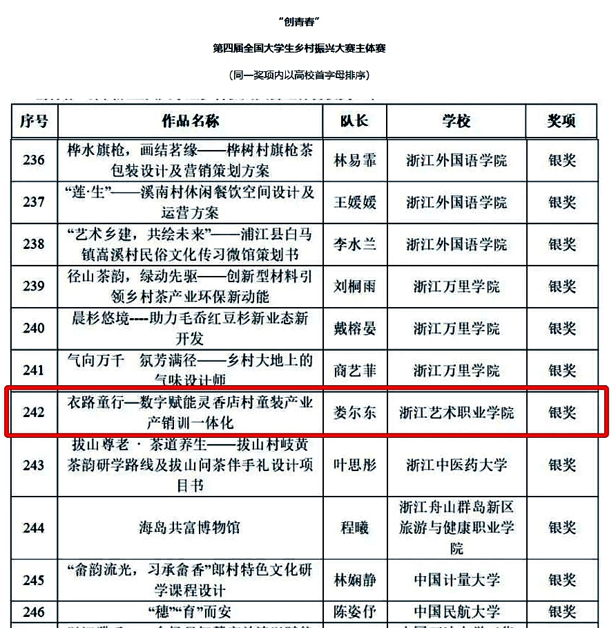 近日,“创青春”第四届全国大学生乡村振兴大赛在杭州闭幕,我校《衣路童行-数字赋能灵香店村童装产业产销训一体化》项目在93所高校、3839支队伍、近3万名师生中脱颖而出,斩获银奖。该项目还在第七届浙江省大学生乡村振兴创意大赛获得金奖。