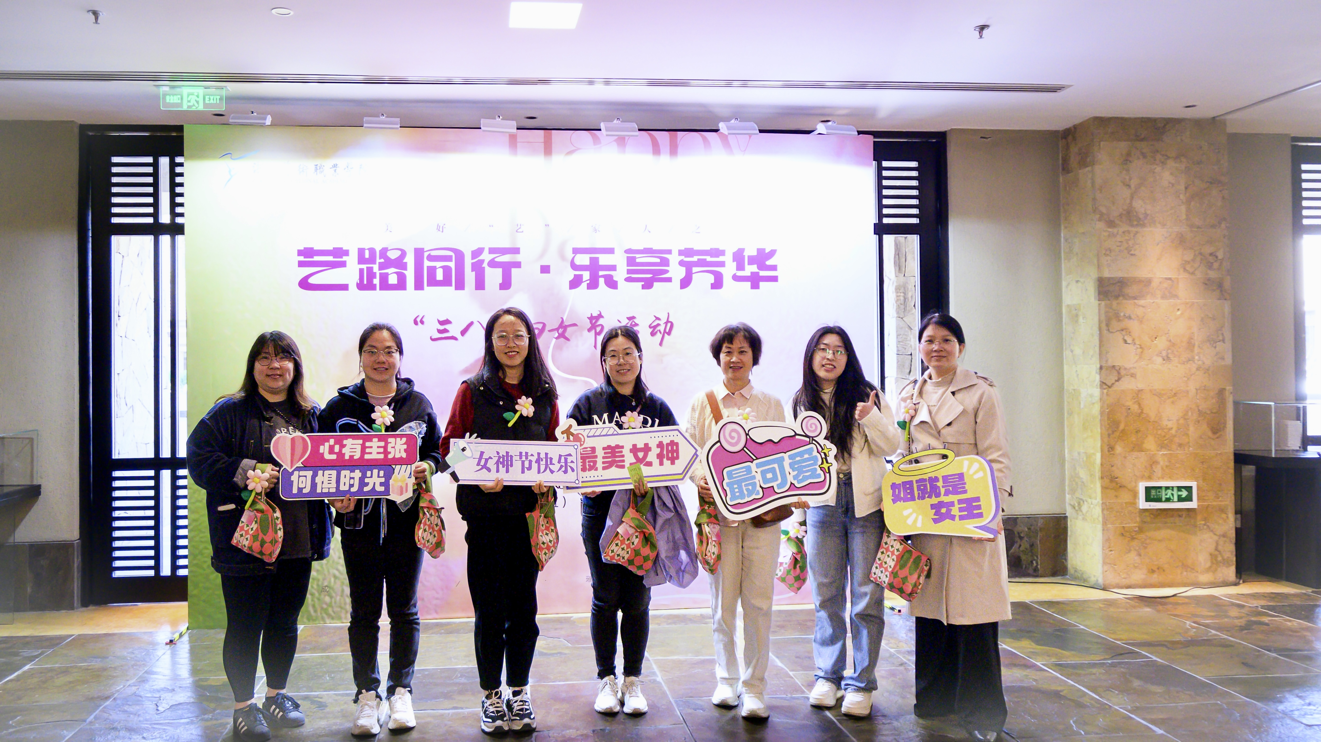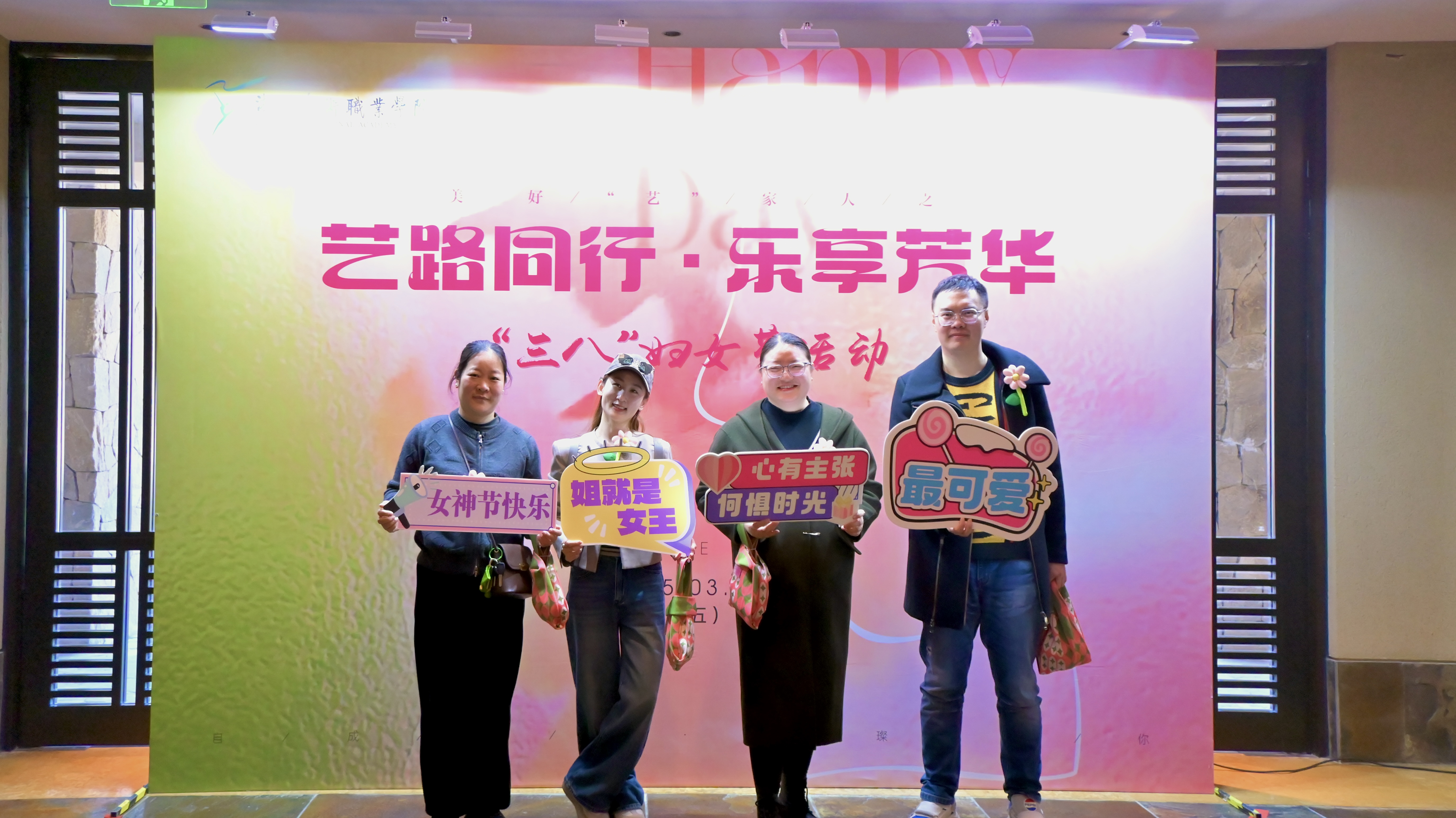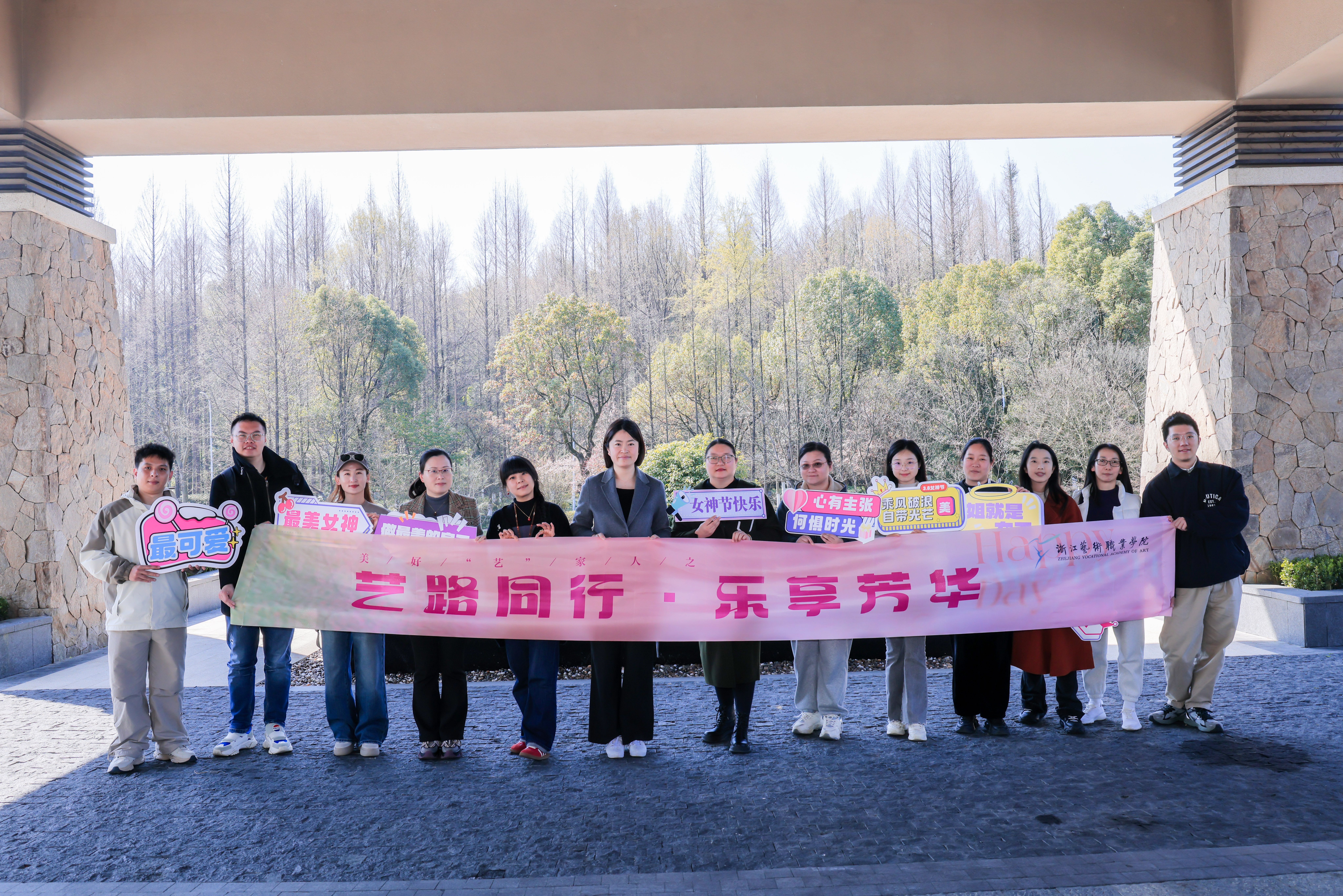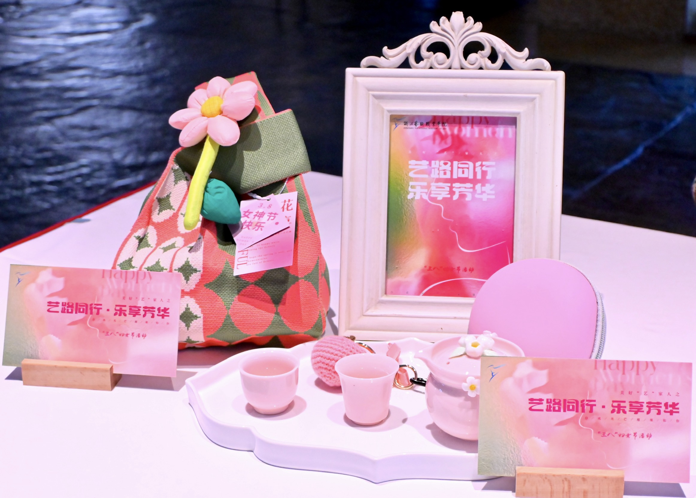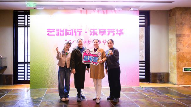 活动现场,从签到台的背景布置,到伴手礼的精心选配,从满面春光的合影留念,到踏春之行的圆满成功,每一个细节都彰显着对女教职工的衷心祝福。既有美好“艺”家人的团队理念,“艺路同行·乐享芳华”的衷心祝愿,“自成光芒·璀璨如你”的诚挚期盼,“女神节快乐”“集美貌与智慧并存”等标语,与充满少女心的蜜桃粉茶具伴手礼搭配,共同织就节日的温暖图景。