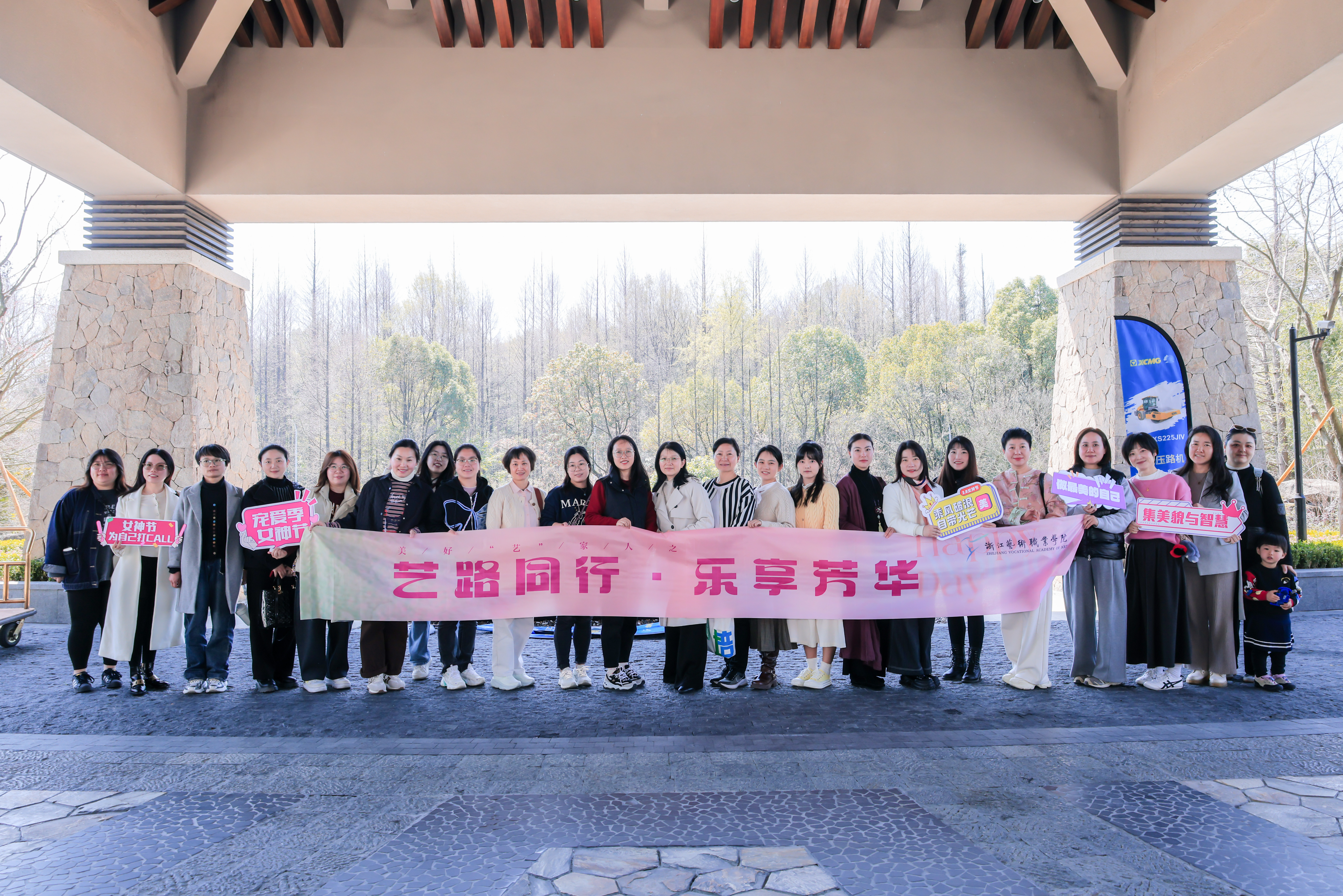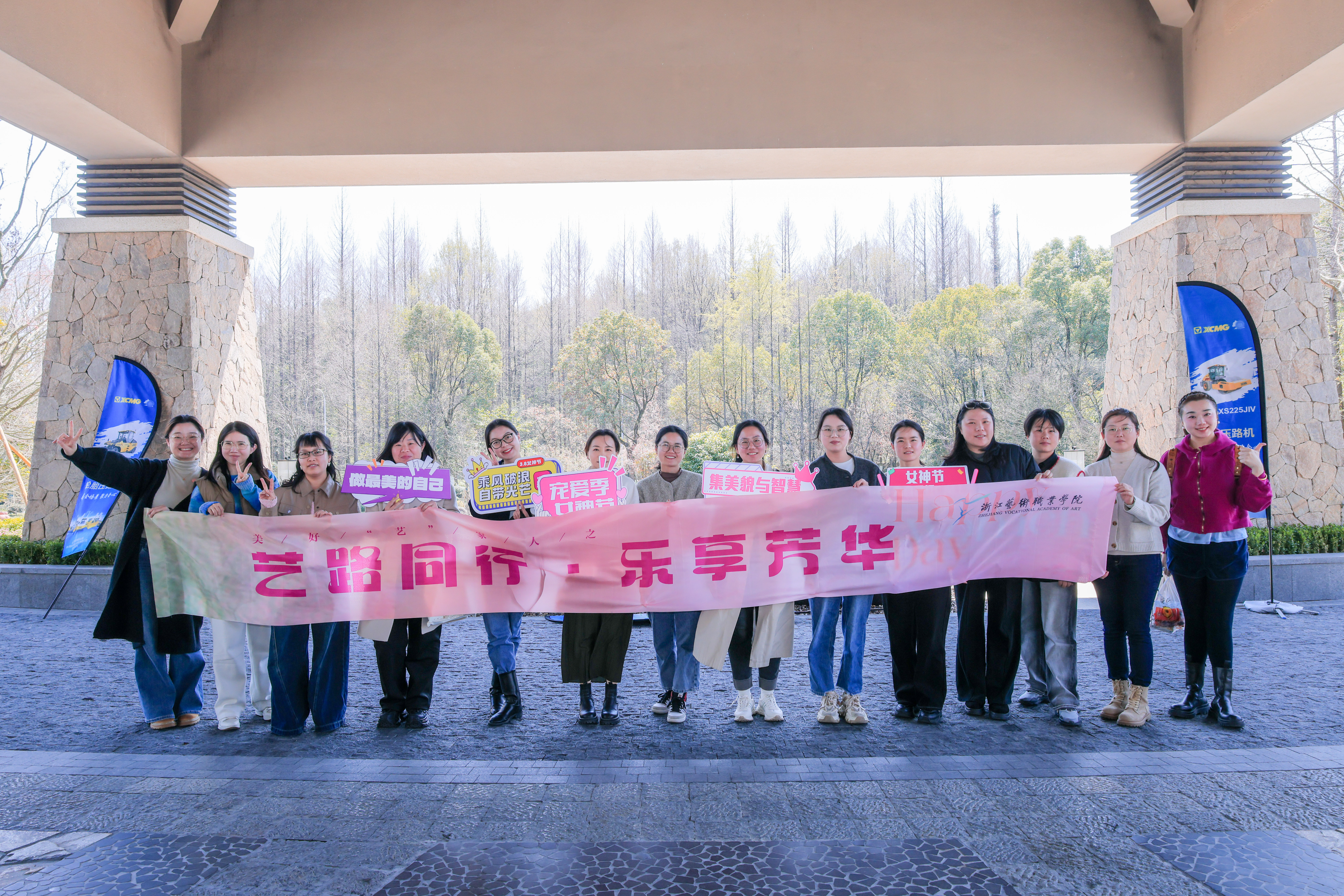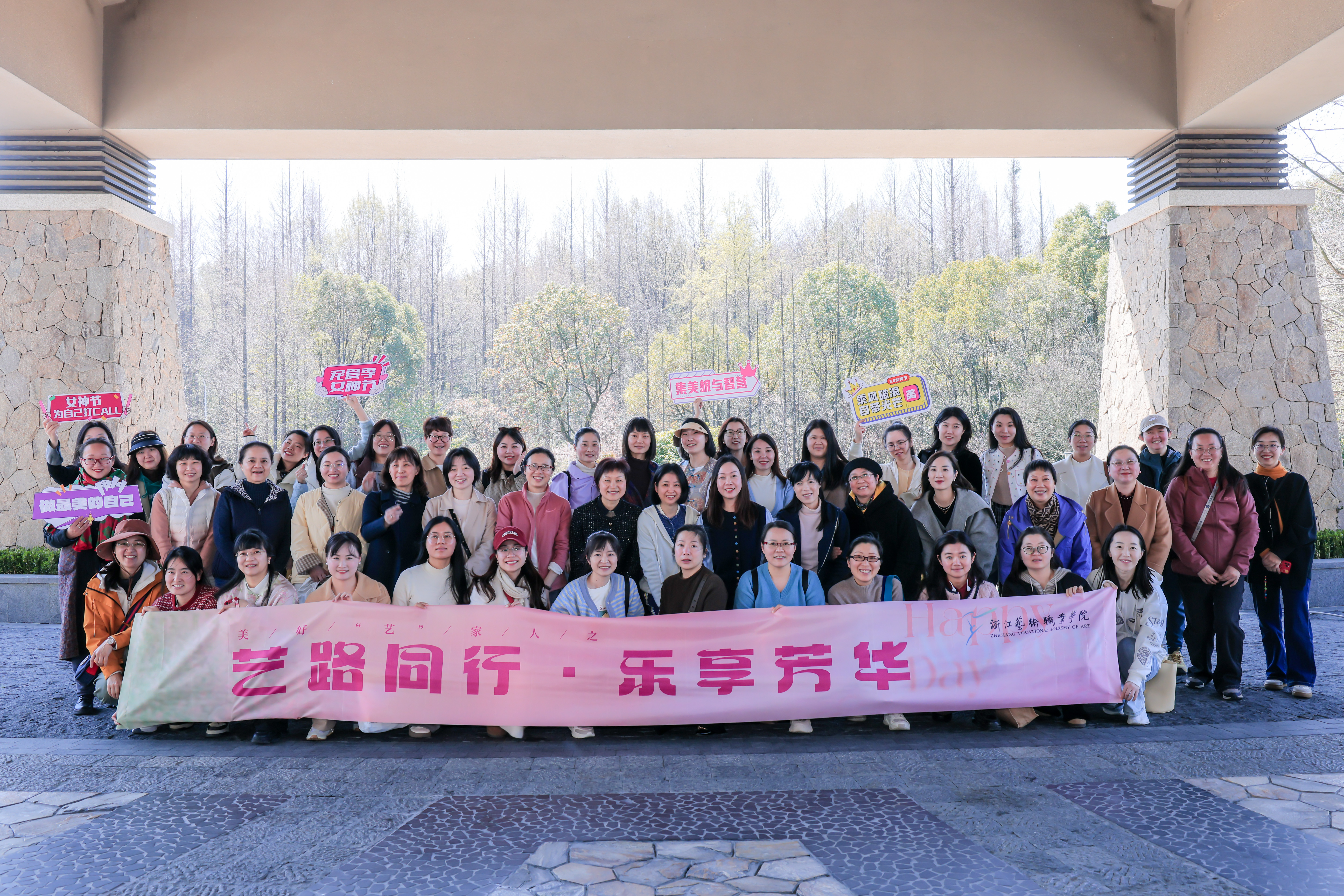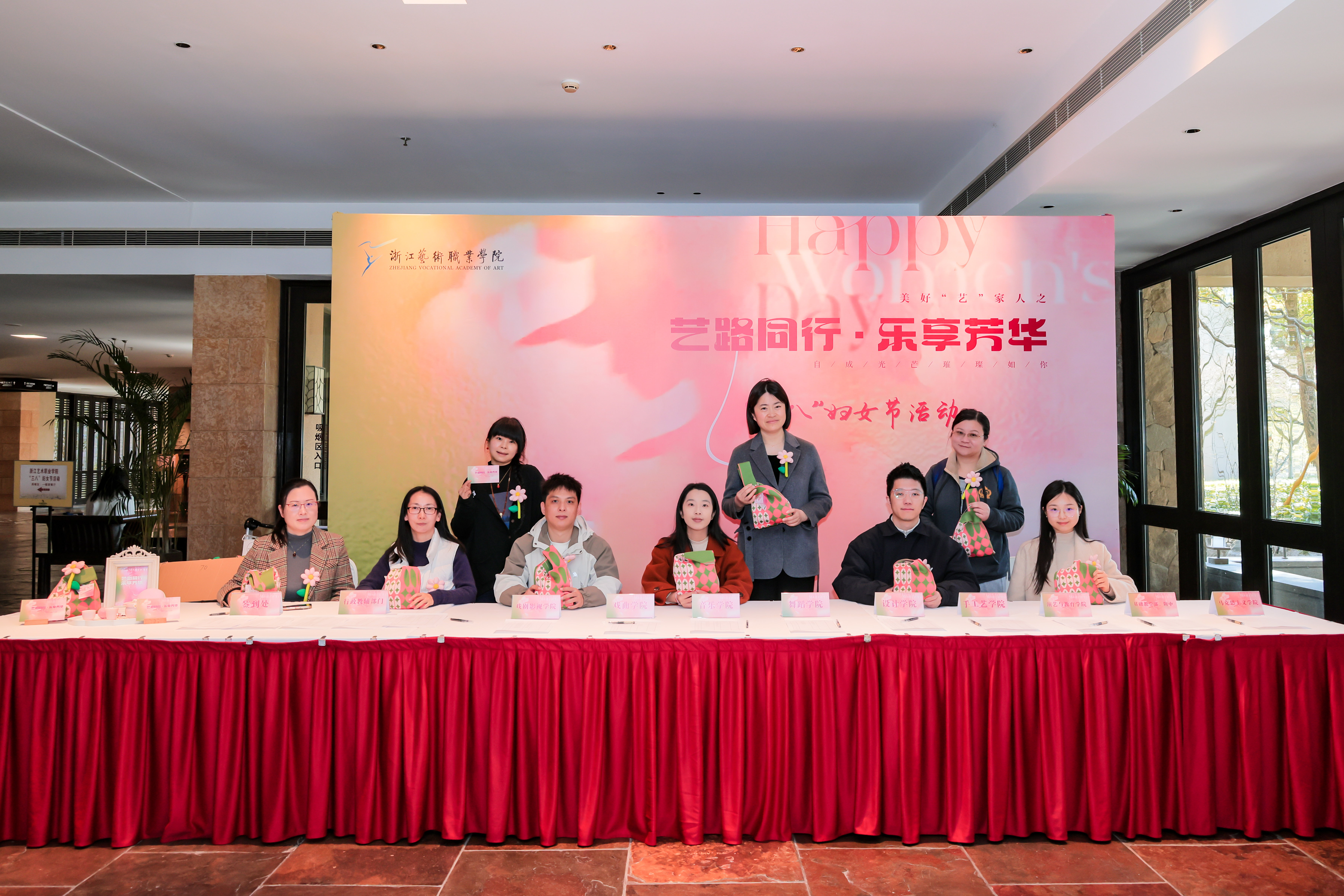 活动现场,从签到台的背景布置,到伴手礼的精心选配,从满面春光的合影留念,到踏春之行的圆满成功,每一个细节都彰显着对女教职工的衷心祝福。既有美好“艺”家人的团队理念,“艺路同行·乐享芳华”的衷心祝愿,“自成光芒·璀璨如你”的诚挚期盼,“女神节快乐”“集美貌与智慧并存”等标语,与充满少女心的蜜桃粉茶具伴手礼搭配,共同织就节日的温暖图景。