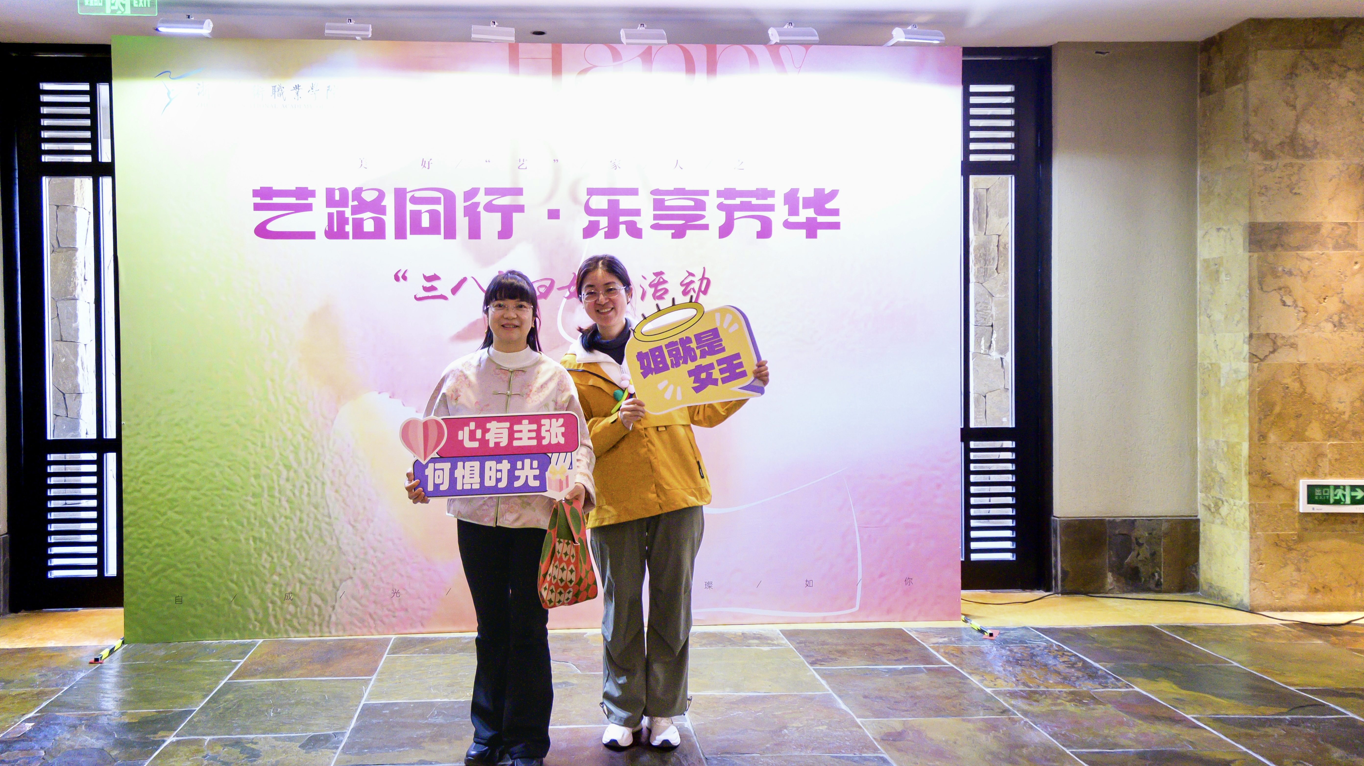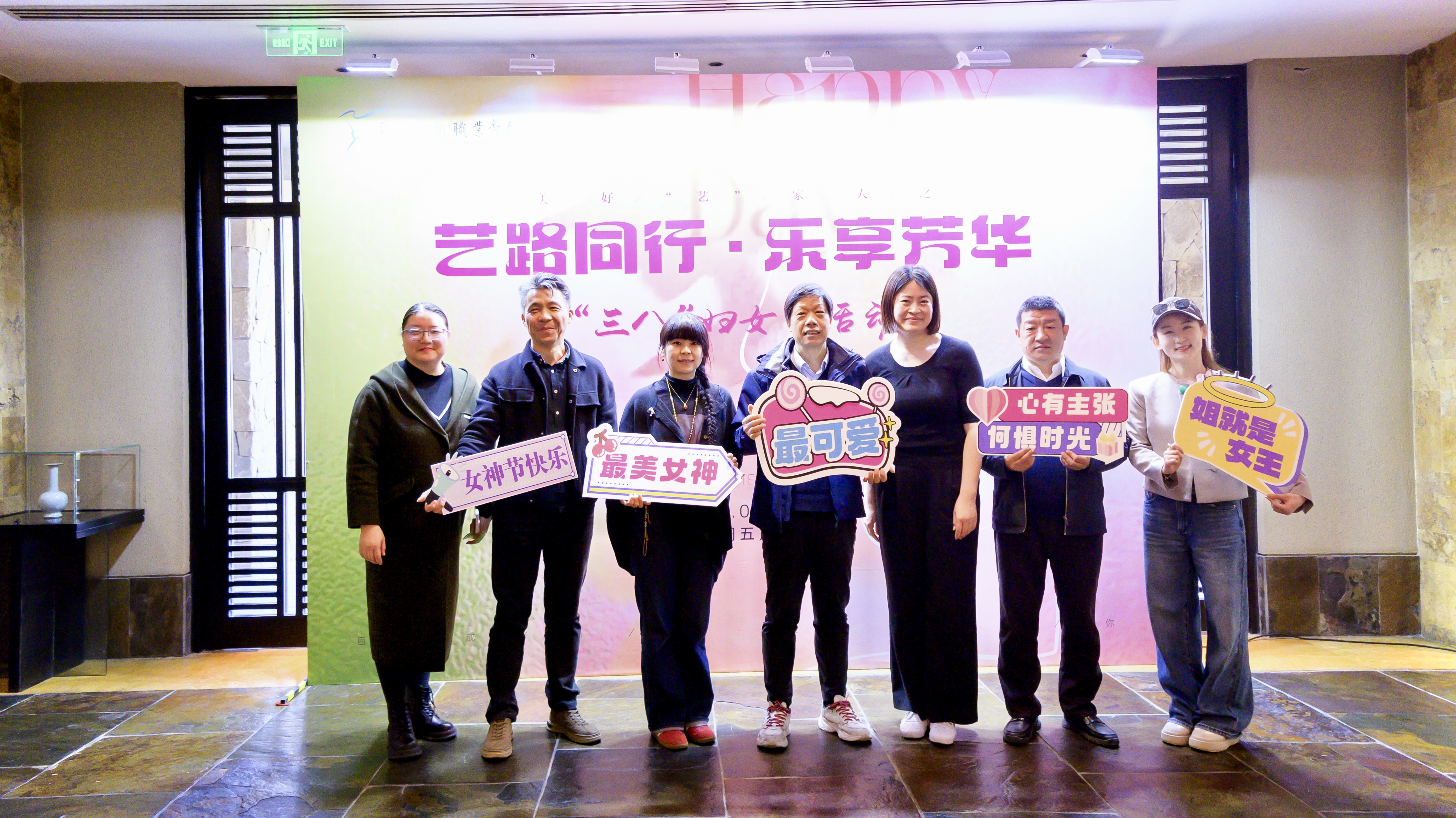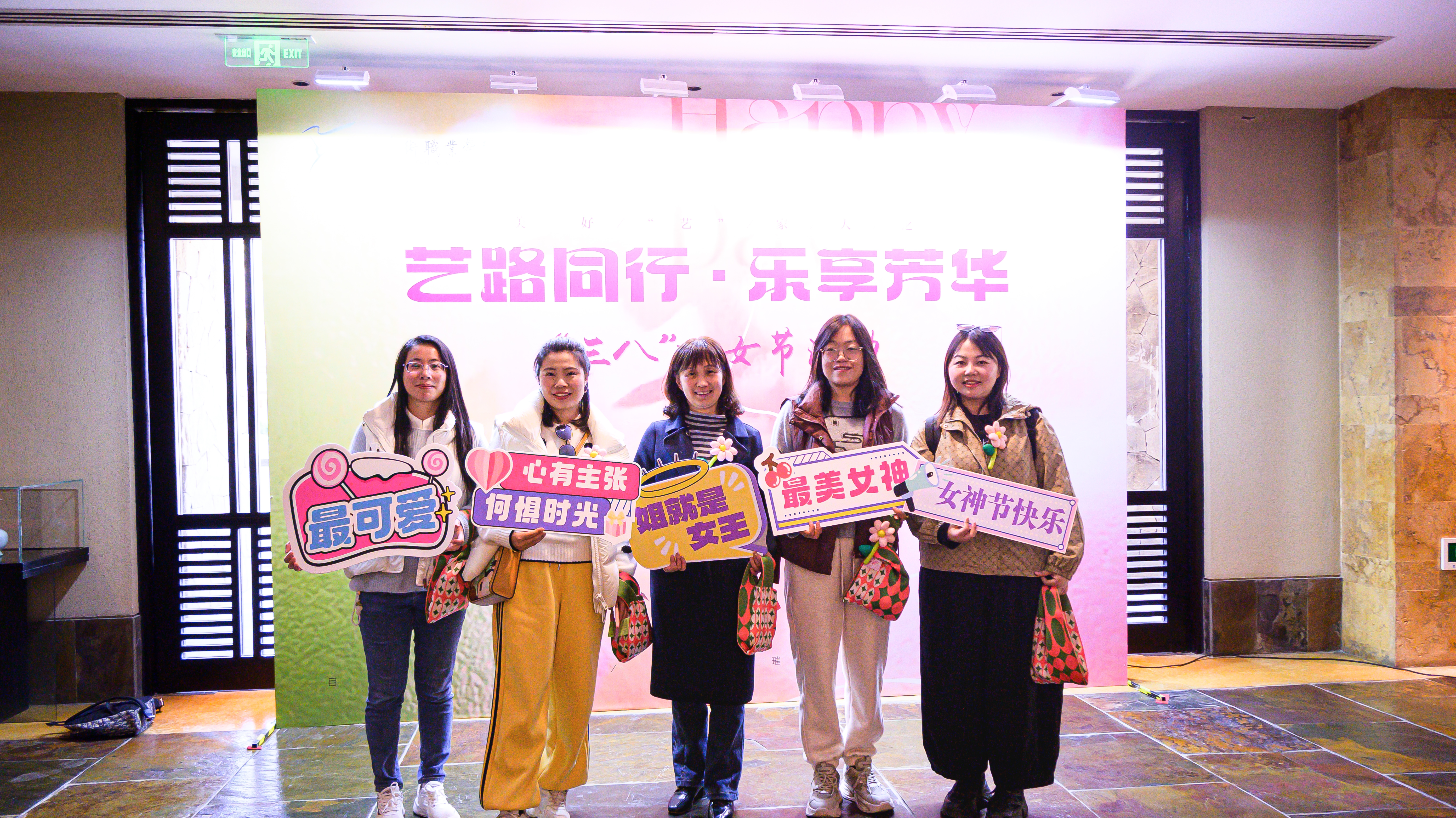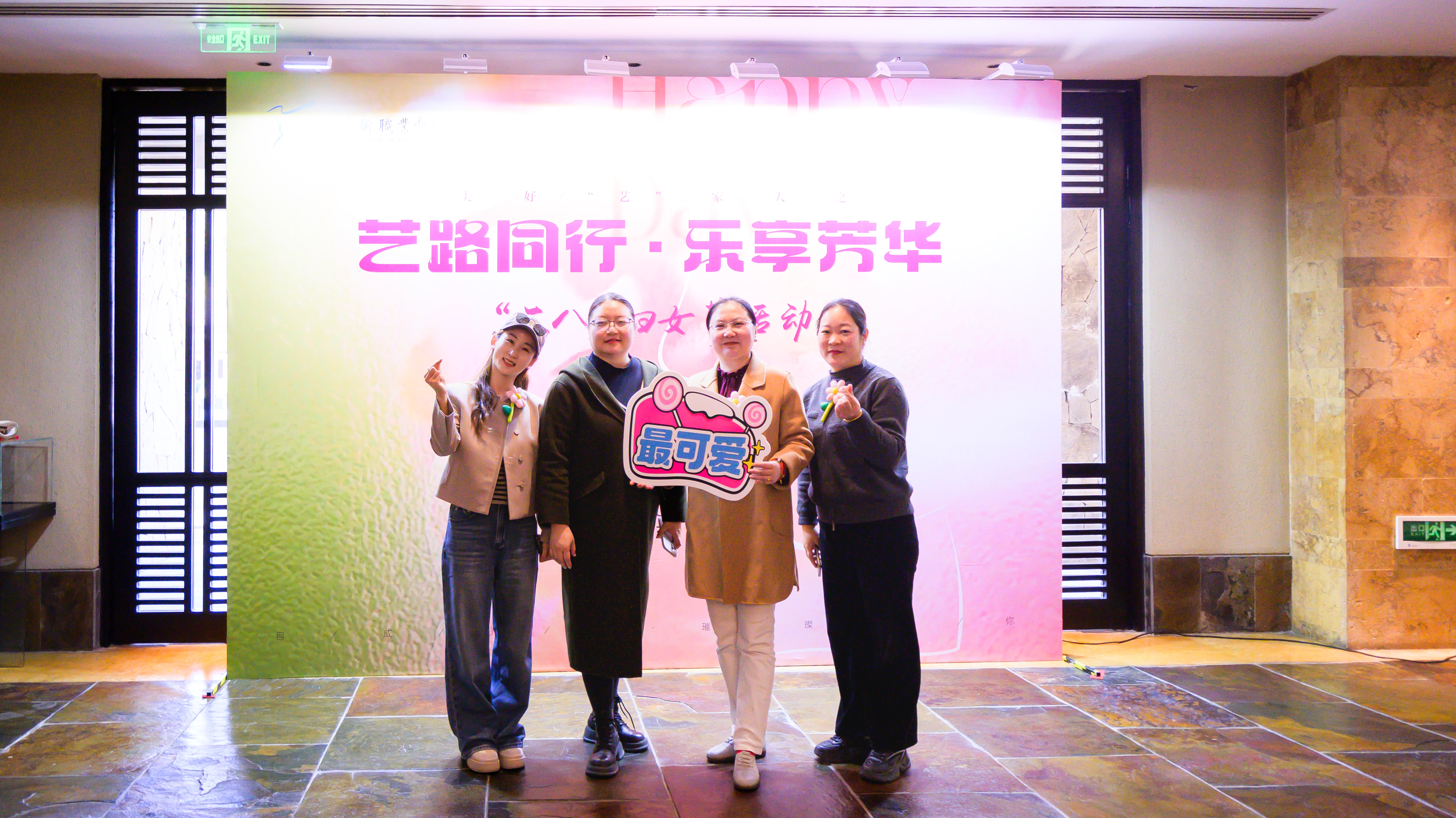 活动现场,从签到台的背景布置,到伴手礼的精心选配,从满面春光的合影留念,到踏春之行的圆满成功,每一个细节都彰显着对女教职工的衷心祝福。既有美好“艺”家人的团队理念,“艺路同行·乐享芳华”的衷心祝愿,“自成光芒·璀璨如你”的诚挚期盼,“女神节快乐”“集美貌与智慧并存”等标语,与充满少女心的蜜桃粉茶具伴手礼搭配,共同织就节日的温暖图景。