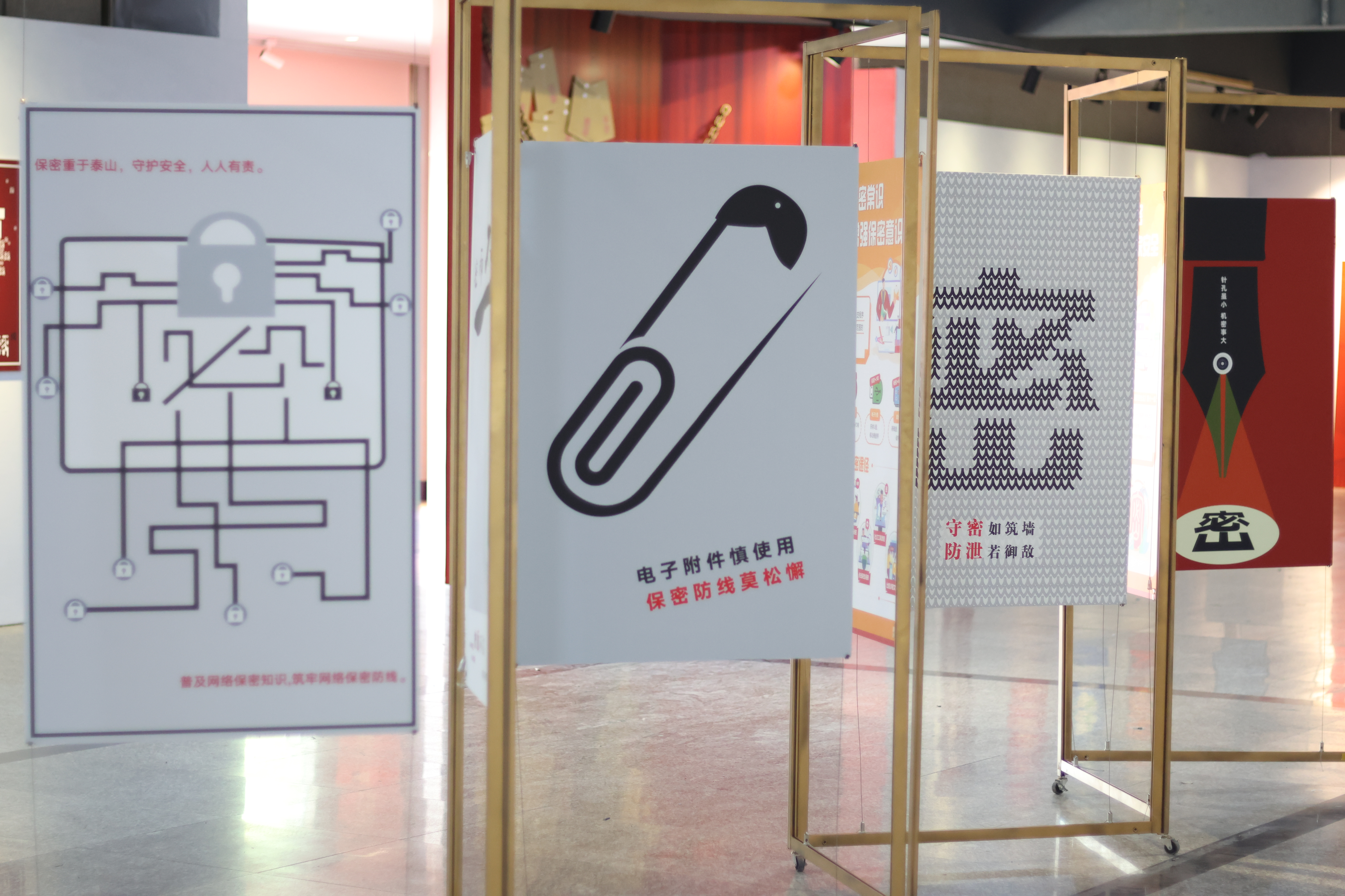 展览分为“学法护密”“警钟长鸣”“防患未然”“视听密语”“‘艺’心守密”“校园筑密”六大板块,展出学生原创保密公益作品共132件,既有构思巧妙、内涵深远的宣传片文案,又有新颖独特、发人深省的宣传海报,还有慧心巧思、技艺娴熟的手工艺作品,展示了我校保密教育创作的丰硕成果。