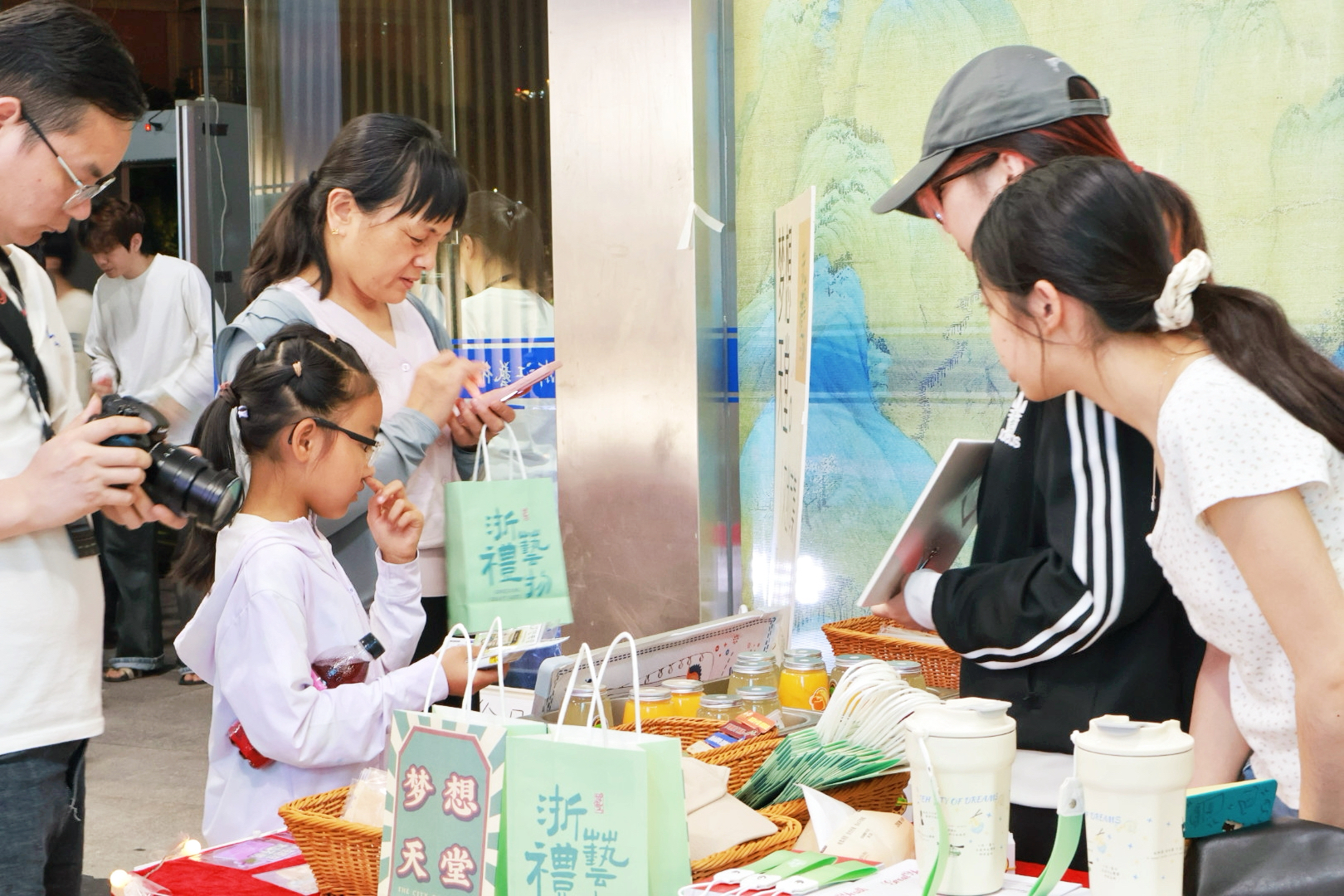 手工艺学院师生团队用文创周边产品延续舞台上的温情和感动,主题冰箱贴、台词种子纸、设计感水杯等创意文创产品吸引众多观众驻足挑选。我们希望发挥专业特长,通过文创市集+话剧表演双线并行,拉近观众与戏剧的距离,延续《梦想天堂》的生命力和感召力。我们致力于让每一位观众都能在周边文创的温度中,感受杭州的“人间烟火”,把“梦想”带回家!