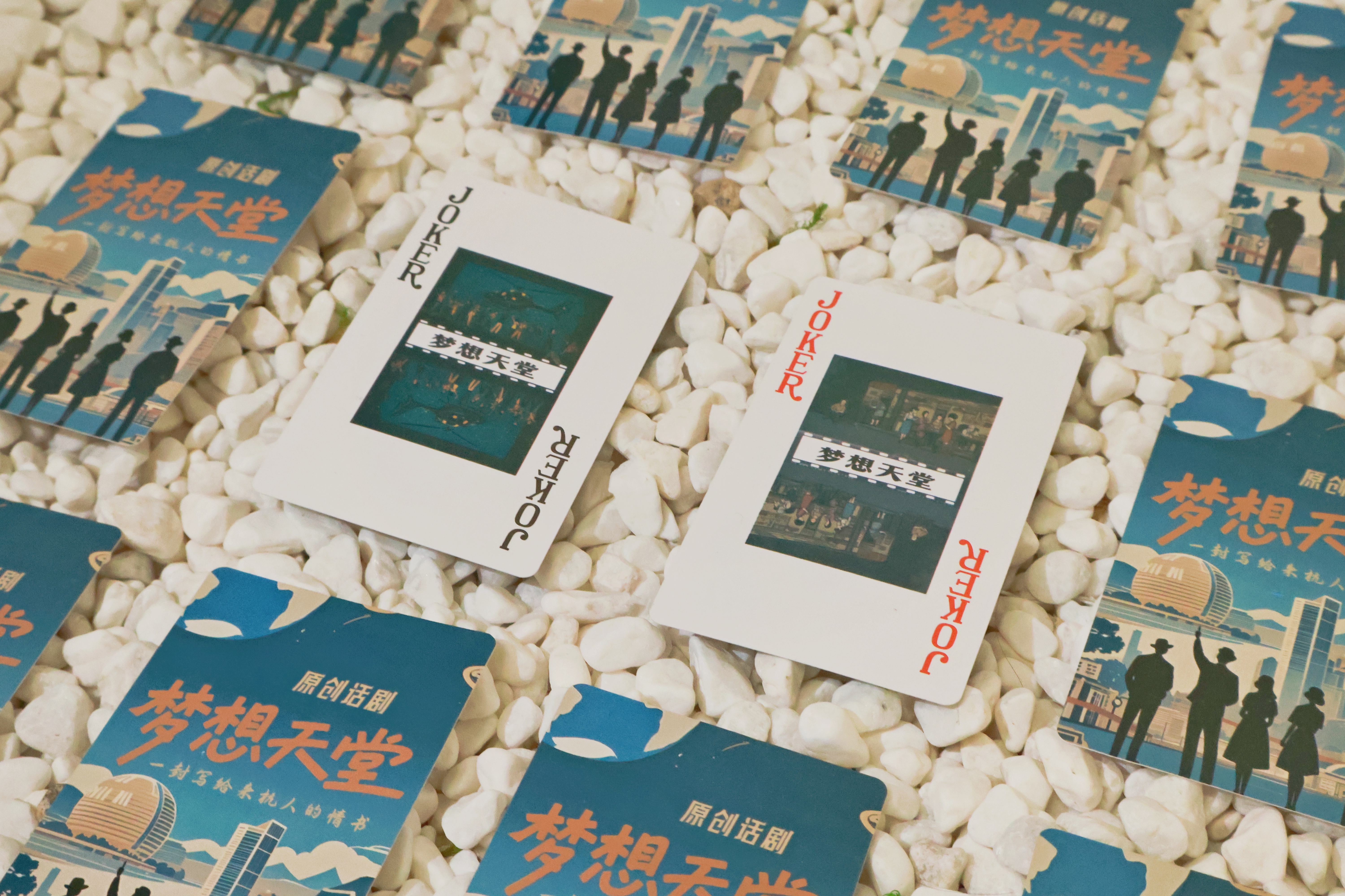 扑克牌整体通过“场景符号+情感叙事”使传统纸牌与话剧内容深度融合。包装正面将《梦想天堂》海报风格化转换,以蓝色为主色调,笔触勾勒环境与人物,更具设计感。包装背面以“浙艺礼物”LOGO为视觉中心体现学院共创,风格与牌面呼应,复古底纹与物件相互配合。牌面按照花色共设计13张基础花色与2张大小王花色,每张牌面整体对剧中元素细腻还原的同时,采用复古插画的创新形式选取剧中经典场景与台词,融入90年代电视、收音机等复古元素,通过鲜活的角色形象,展现出话剧的温情。打造集娱乐、社交与文化体验于一体的怀旧纸牌,让玩家在游戏中重温剧情温度。