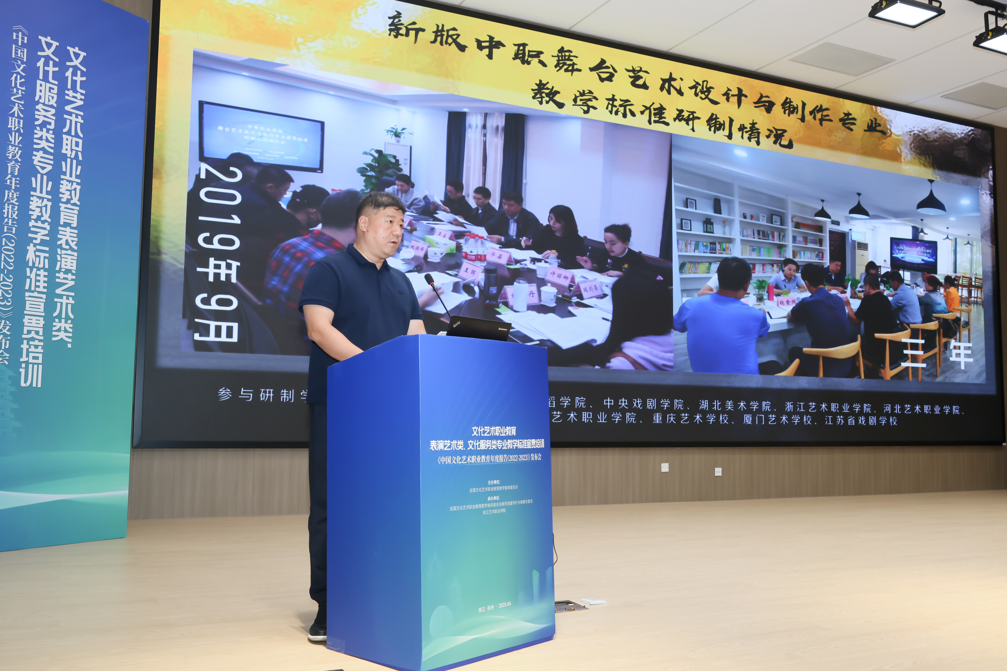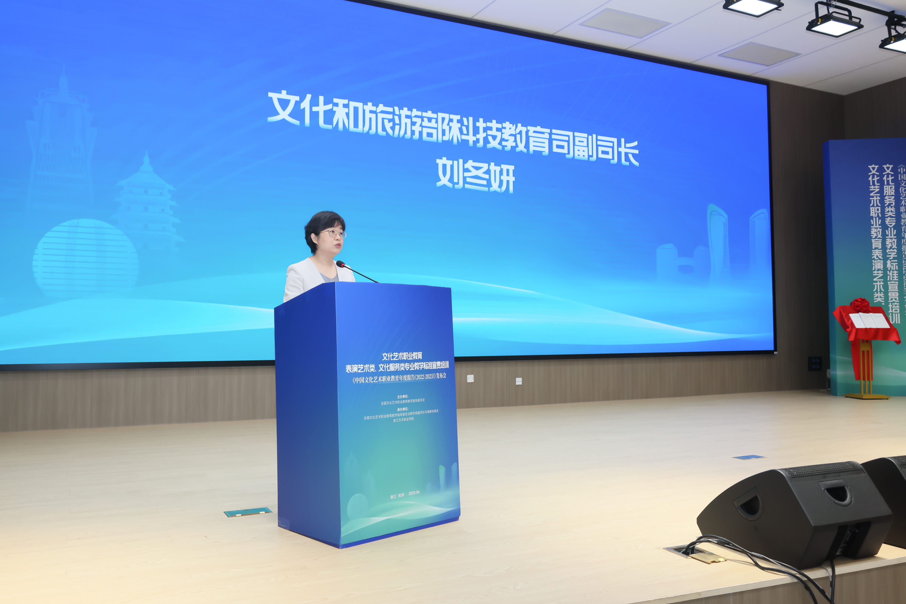 文化和旅游部科技教育司副司长刘冬妍,浙江省文化广电和旅游厅二级巡视员程钢,教育部标准研制综合组组长、教育部教育评估中心原副主任李志宏,文化艺术行指委副主任委员、文化艺术类标准研制工作组副组长黄杭娟,浙江艺术职业学院党委书记薛亮、校长施俊天等出席,近200位文化艺术行指委委员和艺术职业院校负责人、专业带头人、骨干教师等齐聚一堂,共同解读和探讨新版文化艺术类专业教学标准。