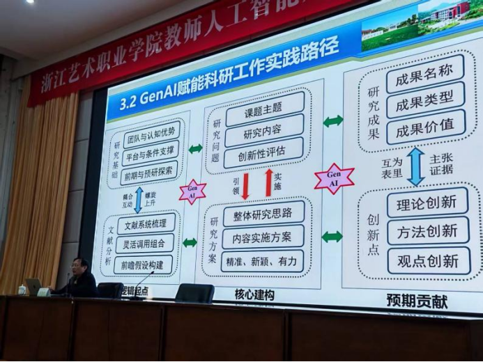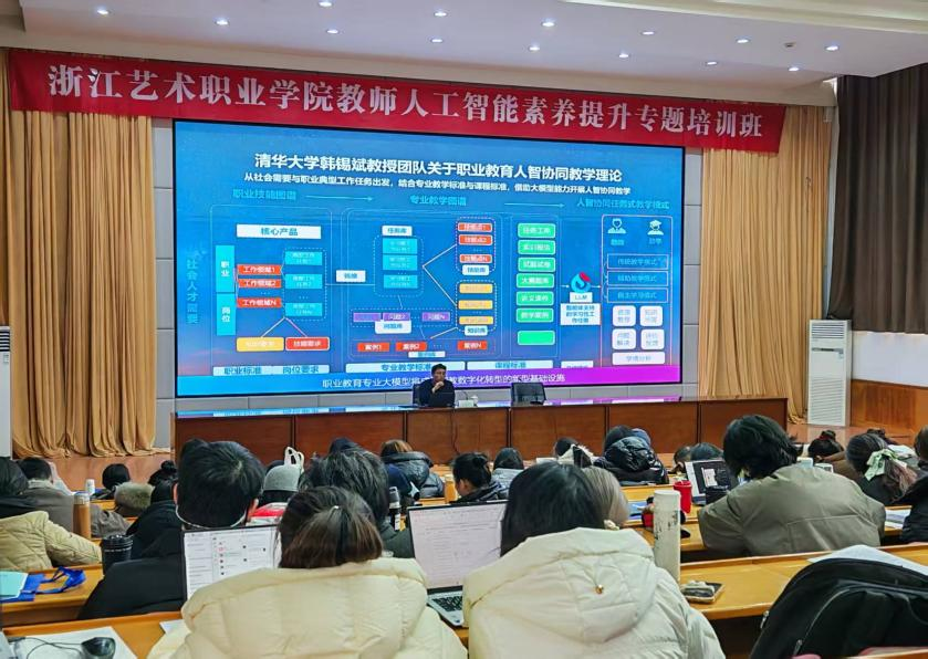 线下集中培训委托浙江工业大学专业团队组织实施,计划共开展三期,面向专任教师和行政管理人员集中培训,旨在通过分层、分类的精准施训,全面赋能教师队伍,推动人工智能技术与艺术教育教学及管理服务的深度融合,为学校教育教学创新与高质量发展注入新动力。1月5日至9日举办第一期专任教师人工智能素养提升培训班。培训聚焦“技术基础、教学创新、科研能力提升与资源建设”四大模块,系统提升艺术类专业教师的人工智能应用素养。课程内容涵盖《大语言模型技术现状及发展趋势》《智能时代教育4.0视阈下的课堂教学变革》《生成式AI驱动教科研范式重构的实践路径》等前沿专题。教学设计注重理论引领与实操演练相结合,通过案例剖析、工具演示与互动研讨,着力帮助教师掌握AI工具在教育场景中的实际应用,实现从“认知”到“应用”的跨越。