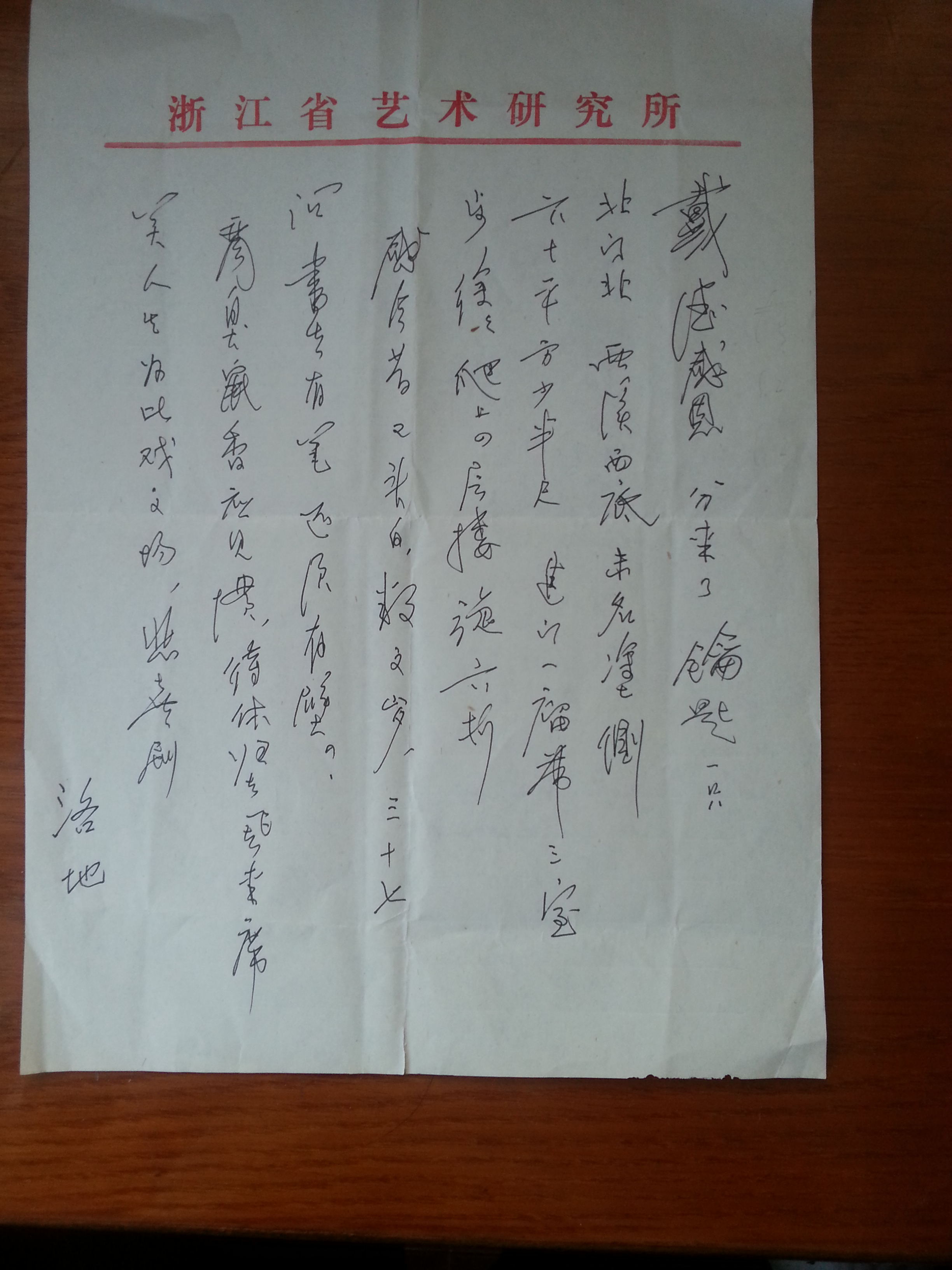 洛地亲笔题写的这首词是送给我个人的,我收藏至今正30年了。他那刚劲有力的书体,正体现其为人与为学。重读此词,倍感亲切,只可惜,他已于去年九月六日因病逝世,我再也无法与他交流了。值此一周年忌日之际,谨撰此文祭奠与愐怀。